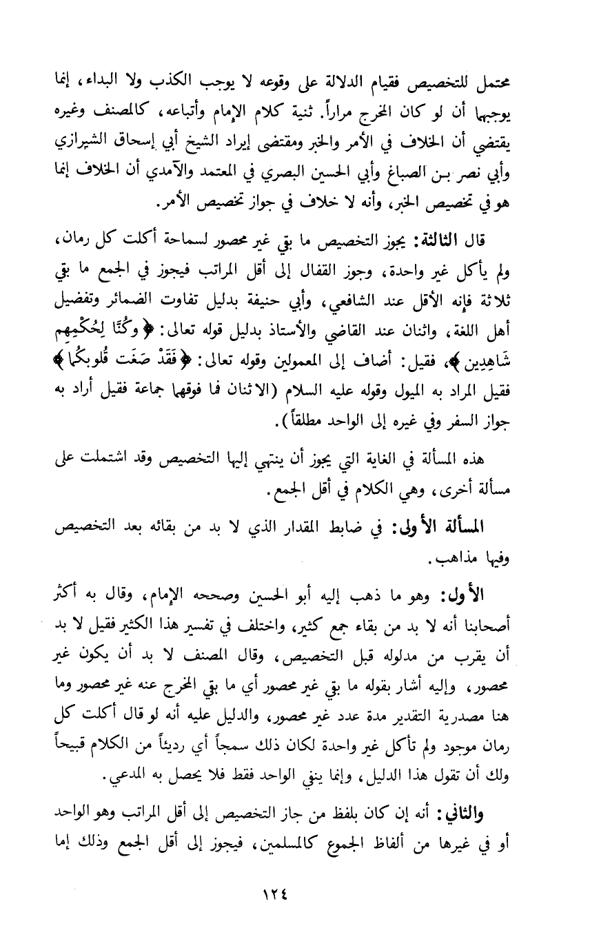 قال الثالثة: يجوز التخصيص ما بقي غير محصور لسماحة أكلت كل رمان ولم يأكل غير واحدة وجوز القفال إلى أقل المراتب فيجوز في الجمع ما بقي ثلاثة فإنه الأقل عند الشافعي وابي حنيفة بدليل تفاوت الضمائر وتفضيل أهل اللغة واثنان عند القاضي والأستاذ بدليل قوله تعالى: {وَكُنَّا لِحُكْمِهِمْ شَاهِدِينَ} فقيل: أضاف إلى المعمولين وقوله تعالى: {فَقَدْ صَغَتْ قُلُوبُكُمَا} فقيل المراد به الميول وقوله عليه السلام: "الاثنان فما فوقهما جماعة" فقيل أراد به جواز السفر وفي غيره إلى الواحد مطلقا.