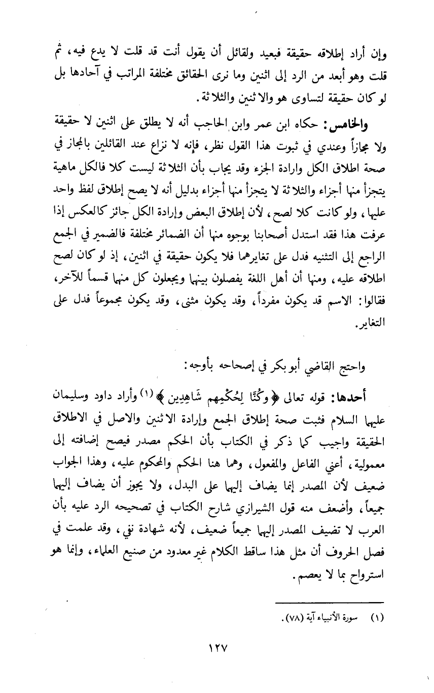 أحدها: قوله تعالى: {وَكُنَّا لِحُكْمِهِمْ شَاهِدِينَ} 1 وأراد داود وسليمان عليهما السلام فثبت صحة إطلاق الجمع وارادة الاثنين والاصل في الاطلاق الحقيقة واجيب كما ذكر في الكتاب بأن الحكم مصدر فيصح إضافته الى معمولية اعني الفاعل والمفعول وهما هنا الحكم والمحكوم عليه وهذا الجواب ضعيف لان المصدر إنما يضاف إليهما على البدل ولا يجوز ان يضاف إليهما جميعا واضعف منه قول الشيرازي شارح الكتاب في تصحيحه الرد عليه بأن العرب لا تضيف المصدر إليهما جميعا ضعيف لأنه شهادة نفي وقد علمت في فصل الحروف ان مثل هذا ساقط الكلام غير معدود من صنيع العلماء وإنما هو استرواح بما لا يعصم.