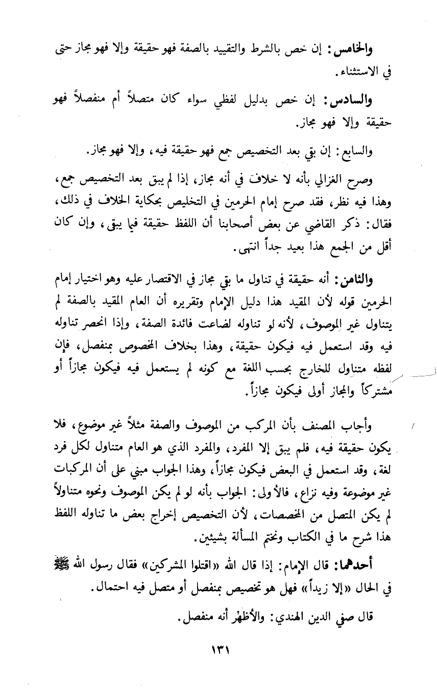 والثامن: انه حقيقة في تناول ما بقي مجاز في الاقتصار عليه وهو اختيار امام الحرمين قوله لان المقيد هذا دليل الإمام وتقريره ان العام المقيد بالصفة لم يتناول غير الموصوف لأنه لو تناوله لضاعت فائدة الصفة وإذا انحصر تناوله فيه وقد استعمل فيه فيكون حقيقة وهذا بخلاف المخصوص بمنفصل فان لفظه متناول للخارج بحسب اللغة مع كونه لم يستعمل فيه فيكون مجازا او مشتركا والمجاز أولى فيكون مجازا.