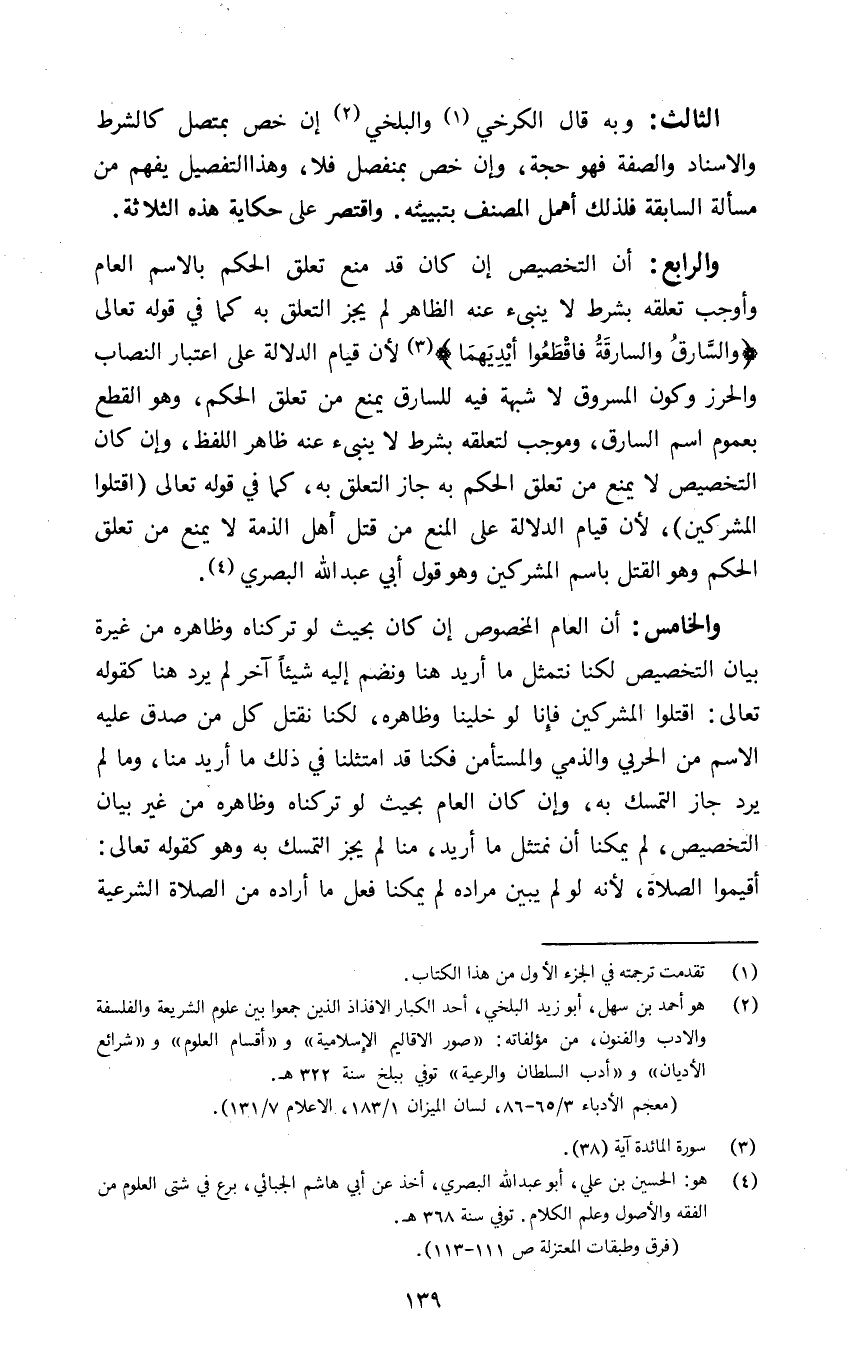 والرابع: ان التخصيص ان كان قد منع تعلق الحكم بالاسم العام وأوجب تعلقه بشرط لا ينبىء عنه الظاهر لم يجز التعلق به كما في قوله تعالى: {وَالسَّارِقُ وَالسَّارِقَةُ فَاقْطَعُوا أَيْدِيَهُمَا} 3 لأن قيام الدلالة على اعتبار النصاب والحرز وكون المسروق لا شبهة فيه للسارق يمنع من تعلق الحكم وهو القطع بعموم اسم السارق وموجب لتعلقه بشرط لا ينبىء عن ظاهر اللفظ وان كان التخصيص لا يمنع من تعلق الحكم به جاز التعلق به كما في قوله تعالى اقتلوا المشركين لأن قيام الدلالة على المنع من قتل أهل الذمة لا يمنع من تعلق الحكم وهو القتل باسم المشركين وهو قول أبي عبد الله البصري4.