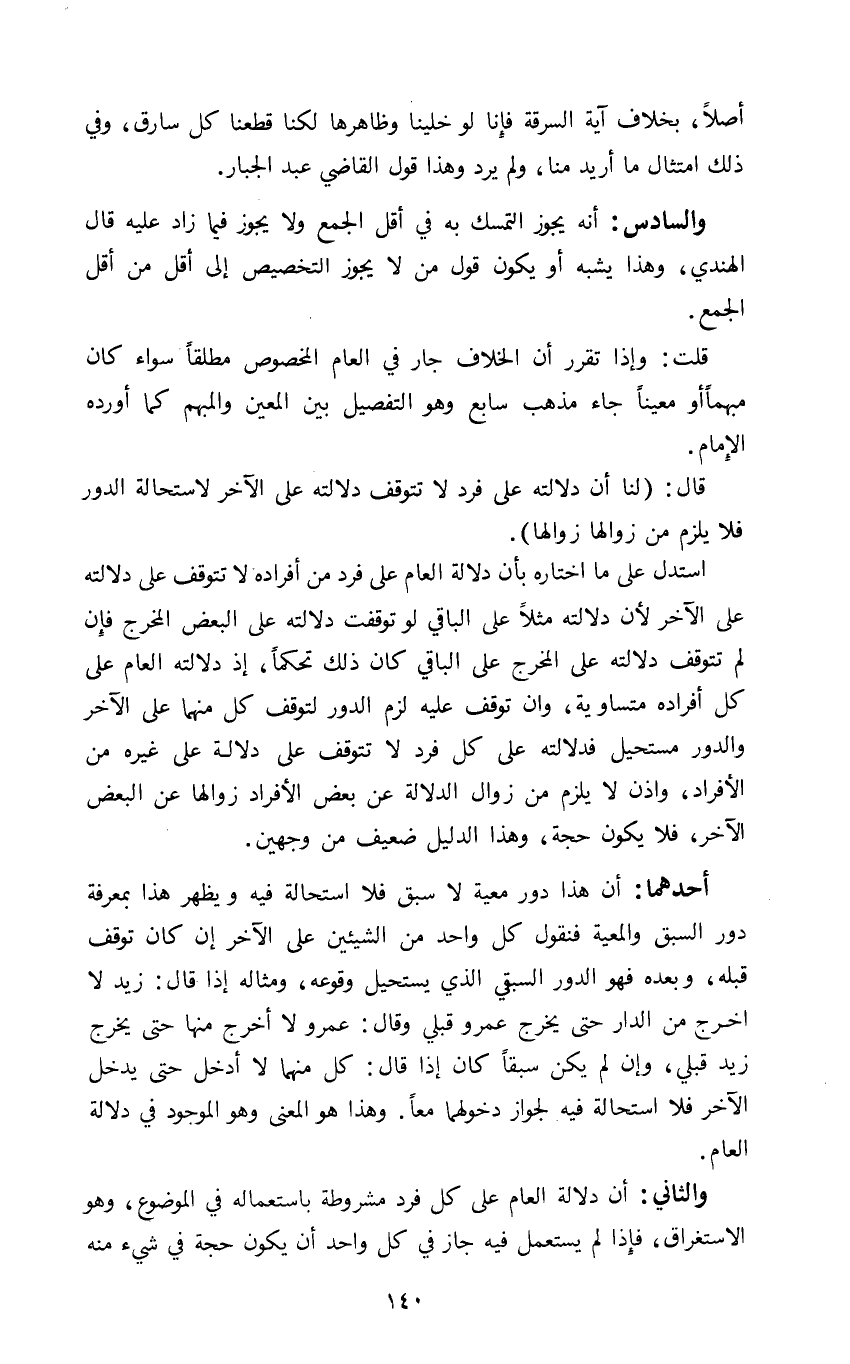 والسادس: انه يجوز التمسك به في اقل الجمع ولا يجوز فيما زاد عليه قال الهندي وهذا يشبه أو يكون قول من لا يجوز التخصيص الى اقل من اقل الجمع.