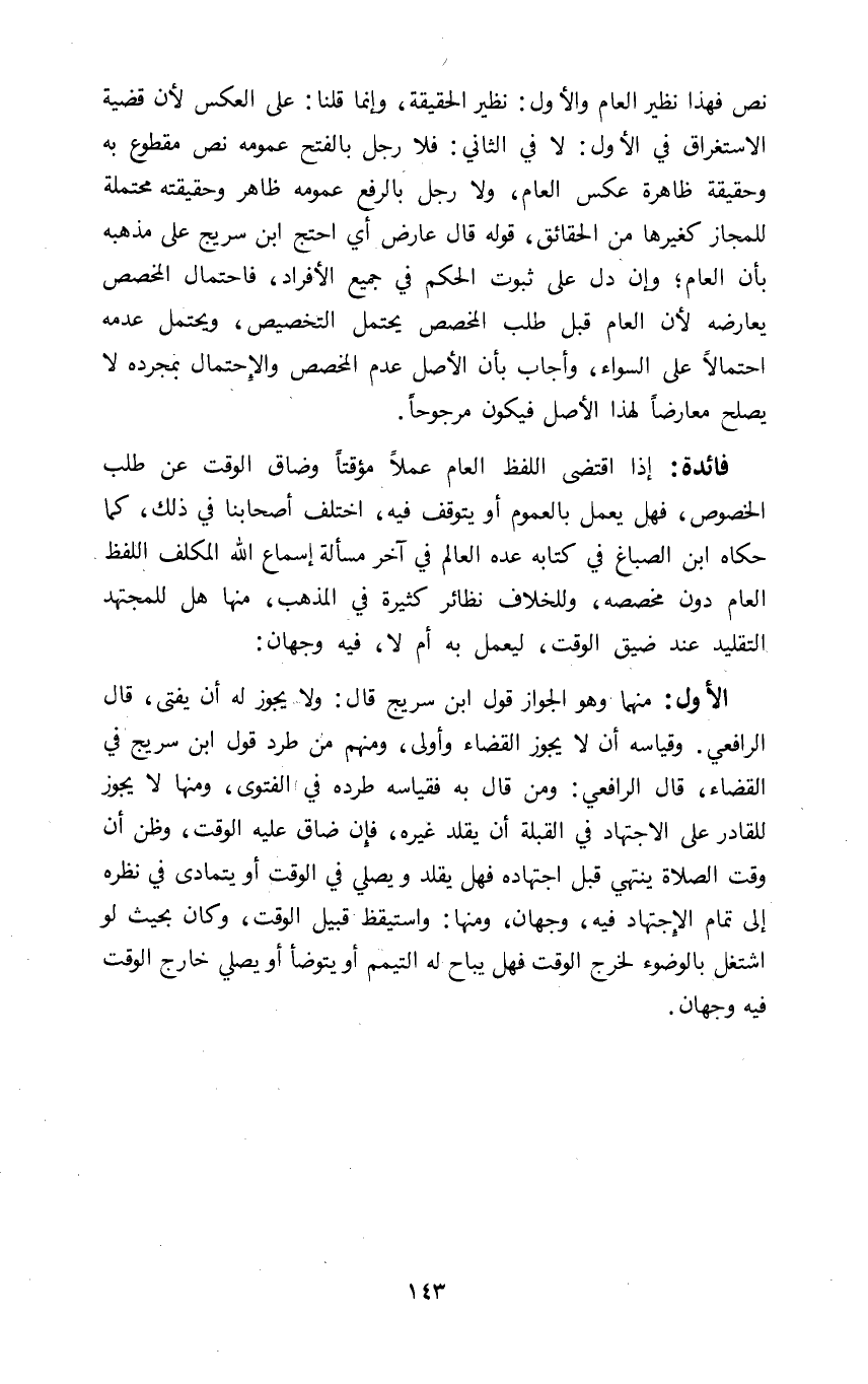 فائدة: إذا اقتضى اللفظ العام عملا مؤقتا وضاق الوقت عن طلب الخصوص فهل يعمل بالعموم أو يتوقف فيه اختلف أصحابنا في ذلك كما حكاه ابن الصباغ في كتابه عده العالم في آخر مسألة إسماع الله المكلف اللفظ العام دون مخصصه وللخلاف نظائر كثيرة في المذهب منها هل للمجتهد التقليد عند ضيق الوقت ليعمل به أم لا فيه وجهان: