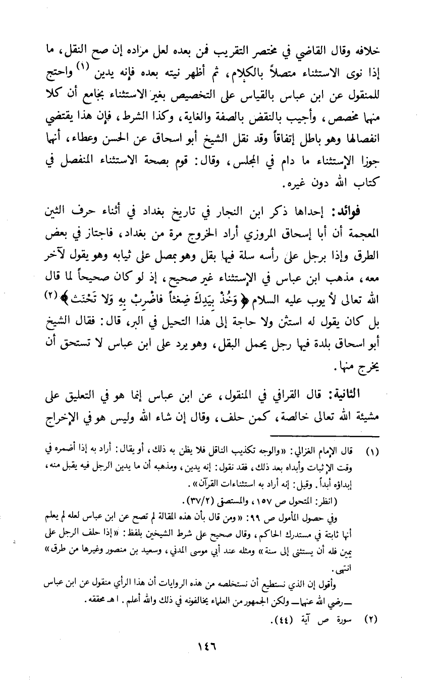 فوائد: إحداها ذكر ابن النجار في تاريخ بغداد في أثناء حرف الثين المعجمة ان أبا إسحاق المروزي أراد الخروج مرة من بغداد فاجتاز في بعض الطرق وإذا برجل على رأسه سلة فيها بقل وهو بمصل على ثيابه وهو يقول لآخر معه مذهب ابن عباس في الإستثناء غير صحيح إذ لو كان صحيحا لما قال الله تعالى لأيوب عليه السلام: {وَخُذْ بِيَدِكَ ضِغْثاً فَاضْرِبْ بِهِ وَلا تَحْنَثْ} 2 بل كان يقول له استثن ولا حاجة الى هذا التحيل في البر قال فقال الشيخ ابو اسحاق بلدة فيها رجل يحمل البقل وهو يرد على ابن عباس لا تستحق ان يخرج منها.