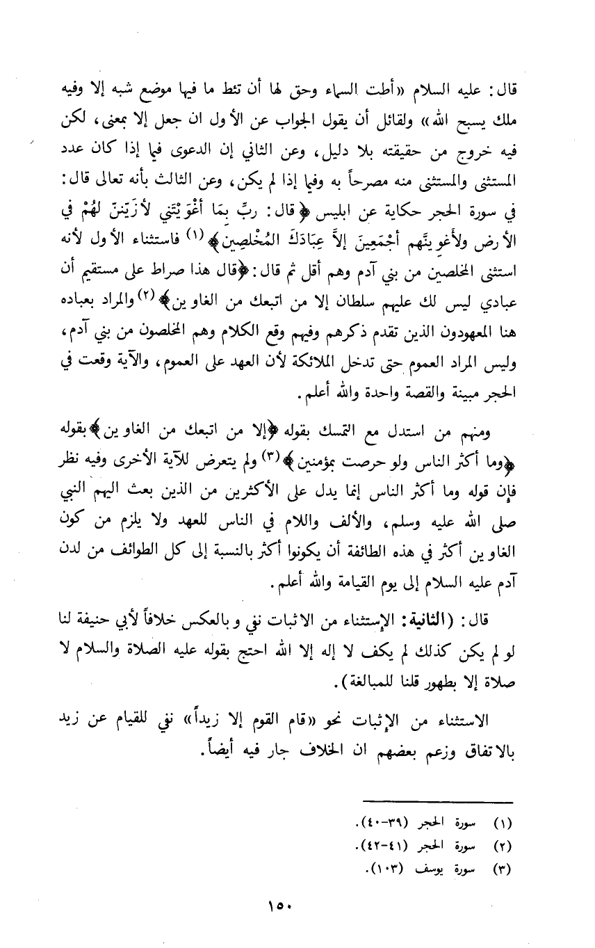 قال: عليه السلام: "أطت السماء وحق لها ان تئط ما فيها موضع شبر إلا وفيه ملك يسبح الله" ولقائل أن يقول الجواب عن الأول ان جعل إلا بمعنى لكن فيه خروج من حقيقته بلا دليل وعن الثاني إن الدعوى فيما إذا كان عدد المستثنى والمستثنى منه مصرحا به وفيما إذا لم يكن وعن الثالث بأنه تعالى قال في سورة الحجر حكاية عن إبليس: {قَالَ رَبِّ بِمَا أَغْوَيْتَنِي لَأُزَيِّنَنَّ لَهُمْ فِي الْأَرْضِ وَلَأُغْوِيَنَّهُمْ أَجْمَعِينَ ِلَّا عِبَادَكَ مِنْهُمُ الْمُخْلَصِينَ} 1 فاستثناء الأول لأنه استثنى المخلصين من بني آدم وهم أقل ثم قال: {قَالَ هَذَا صِرَاطٌ عَلَيَّ مُسْتَقِيمٌ إِنَّ عِبَادِي لَيْسَ لَكَ عَلَيْهِمْ سُلْطَانٌ إِلَّا مَنِ اتَّبَعَكَ مِنَ الْغَاوِينَ} 2 والمراد بعباده هنا المعهودون الذين تقدم ذكرهم وفيهم وقع الكلام وهم المخلصون من بني آدم وليس المراد العموم حتى تدخل الملائكة لأن العهد على العموم والآية وقعت في الحجر مبينة والقصة واحدة والله أعلم.