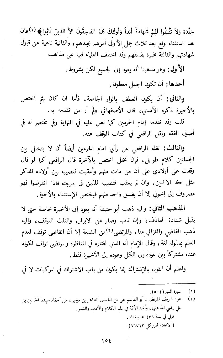 المذهب الثاني: وإليه ذهب أبو حنيفة أنه يعود إلى الأخيرة خاصة حتى لا يقبل شهادة القاذف وإن تاب وصار من الأبرار والثلث التوقف وإليه ذهب القاضي والغزالي منا والمرتضى2 من الشيعة إلا أن القاضي توقف لعدم العلم بمدلوله لغة وقال الإمام أنه الذي نختاره في المناظرة والمرتضى توقف لكونه عنده مشتركا بين عوده إلى الكل وعوده إلى الأخيرة فقط.