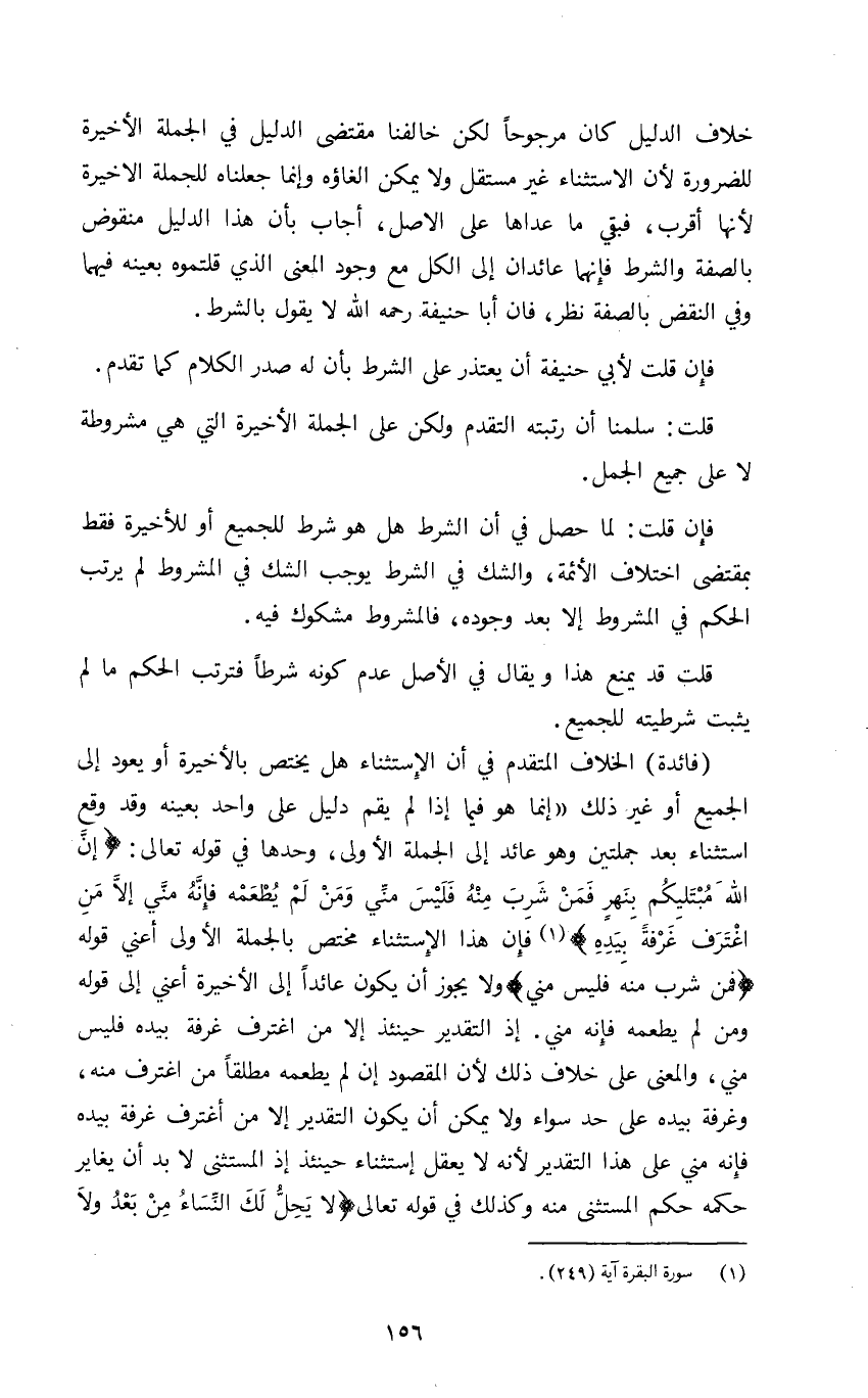 خلاف الدليل كان مرجوحا لكن خالفنا مقتضى الدليل في الجملة الأخيرة للضرورة لأن الاستثناء غير مستقل ولا يمكن إلغاؤه وإنما جعلناه للجملة الأخيرة لأنها اقرب فبقى ما عداها على الأصل أجاب بأن هذا الدليل منقوض بالصفة والشرط فإنهما عائدان إلى الكل مع وجود المعنى الذي قلتموه بعينه فيهما وفي النقض بالصفة نظر فان أبا حنيفة رحمه الله لا يقول بالشرط.