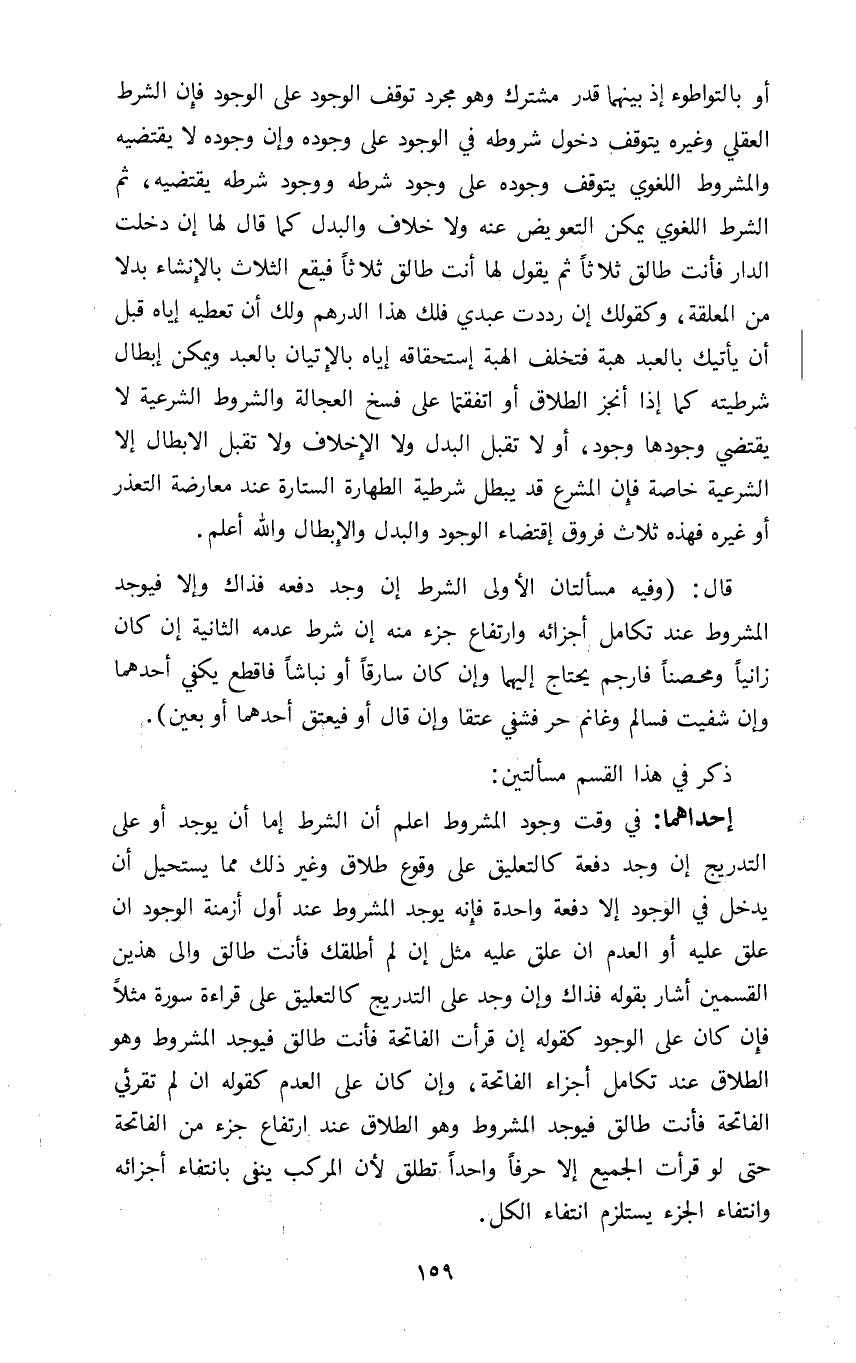 أو بالتواطؤ إذ بينهما قدر مشترك وهو مجرد توقف الوجود على الوجود فان الشرط العقلي وغيره يتوقف دخول شروطه في الوجود على وجوده وإن وجوده لا يقتضيه والمشروط اللغوي يتوقف وجوده على وجود شرطه ووجود شرطه يقتضيه ثم الشرط اللغوي يمكن التعويض عنه ولا خلاف والبدل كما قال لها إن دخلت الدار فأنت طالق ثلاثا ثم يقول لها أنت طالق ثلاثا فيقع الثلاث بالإنشاء بدلا من المعلقة وكقولك ان رددت عبدي فلك هذا الدرهم ولك ان تعطيه إياه قبل ان يأتيك بالعبد هبة فتختلف الهبة إستحقاقه إياه بالإتيان بالعبد ويمكن إبطال شرطيته كما إذا أنجز الطلاق او اتفقتما على فسخ العجالة والشروط الشرعية لا يقتضي وجودها وجود او لا تقبل البدل ولا الإخلاف ولا تقبل الإبطال إلا الشرعية خاصة فإن المشرع قد يبطل شرطية الطهارة الستارة عند معارضة التعذر أو غيره فهذه ثلاث فروق إقتضاء الوجود والبدل والإبطال والله اعلم.
