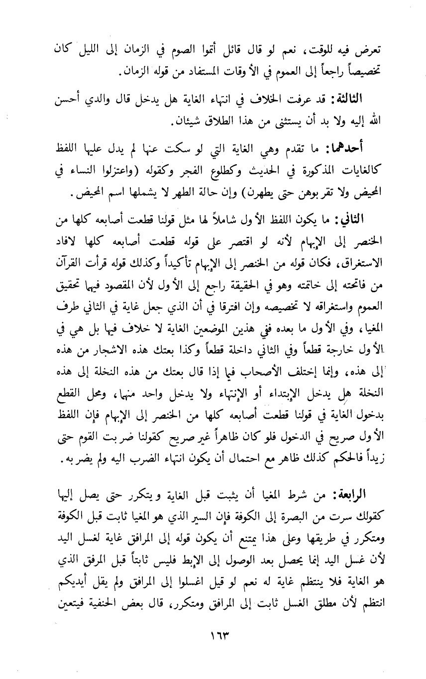 الرابعة: من شرط المغيا أن يثبت قبل الغاية ويتكرر حتى يصل إليها كقولك سرت من البصرة إلى الكوفة فإن السير الذي هو المغيا ثابت قبل الكوفة ومتكرر في طريقها وعلى هذا يمتنع أن يكون قوله إلى المرافق غاية لغسل اليد لأن غسل اليد إنما يحصل بعد الوصول إلى الإبط فليس ثابتا قبل المرفق الذي هو الغاية فلا ينتظم غاية له نعم لو قيل اغسلوا إلى المرافق ولم يقل أيديكم انتظم لأن مطلق الغسل ثابت إلى المرافق ومتكرر قال بعض الحنفية فيتعين