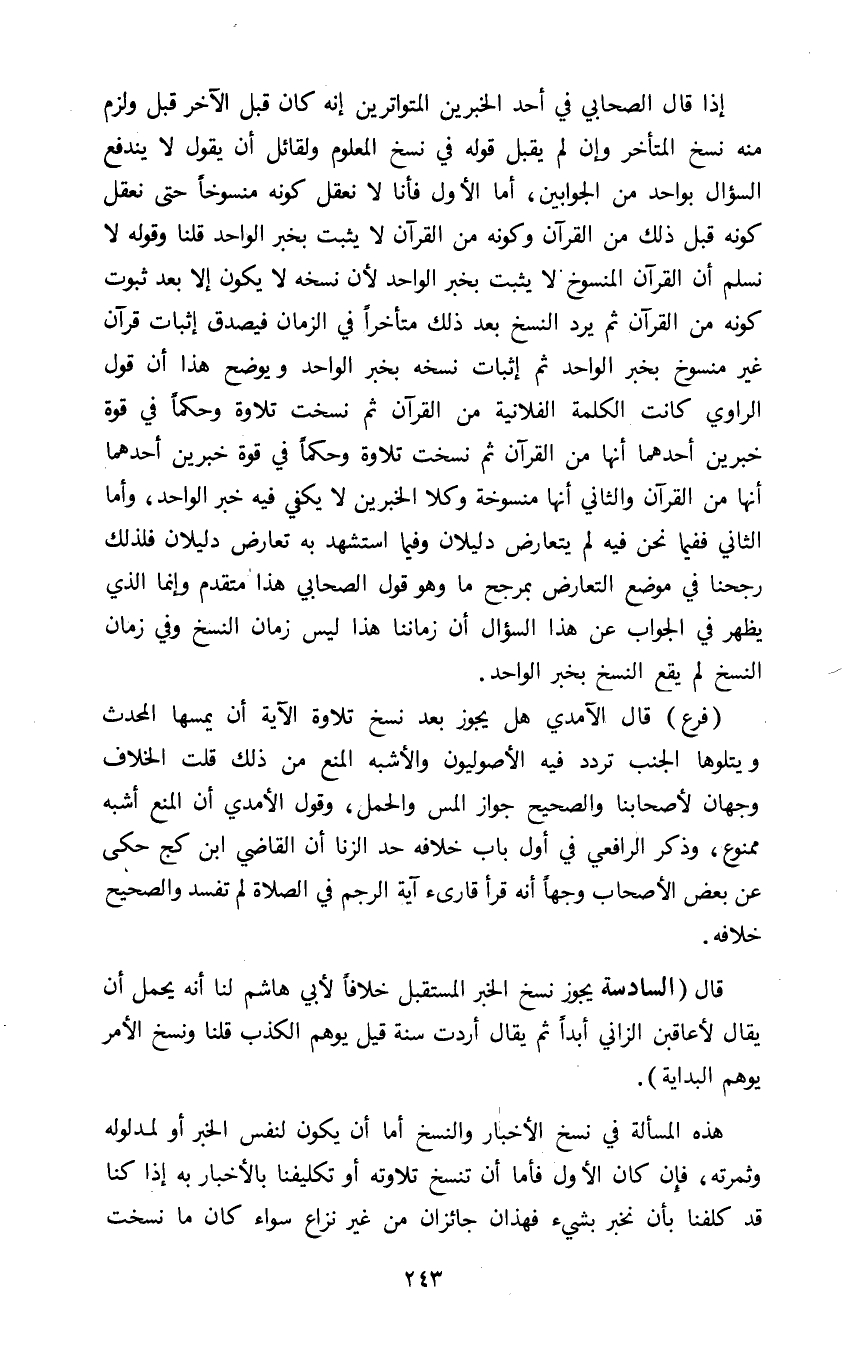 فرع: قال الآمدي هل يجوز بعد نسخ تلاوة الآية ان يمسها المحدث ويتلوها الجنب تردد فيه الأصوليون والأشبه المنع من ذلك قلت الخلاف وجهان لأصحابنا والصحيح جواز المس والحمل وقول الآمدي ان المنع أشبه ممنوع وذكر الرافعي في أول باب خلافه حد الزنا ان القاضي ابن كج حكى عن بعض الأصحاب وجها انه قرأ قارىء آية الرجم في الصلاة لم تفسد والصحيح خلافه.