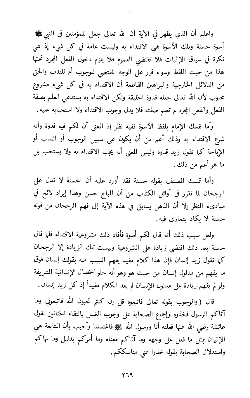 وأما تمسك الإمام بلفظ الأسوة ففيه نظر إذ المعنى ان لكم فيه قدوة وانه شرع الاقتداء به وذلك اعم من ان يكون على سبيل الوجوب أو الندب أو الإباحة كما تقول زيد قدمه وليس المعنى انه يجب الاقتداء به ولا يستحب بل ما هو أعم من ذلك.