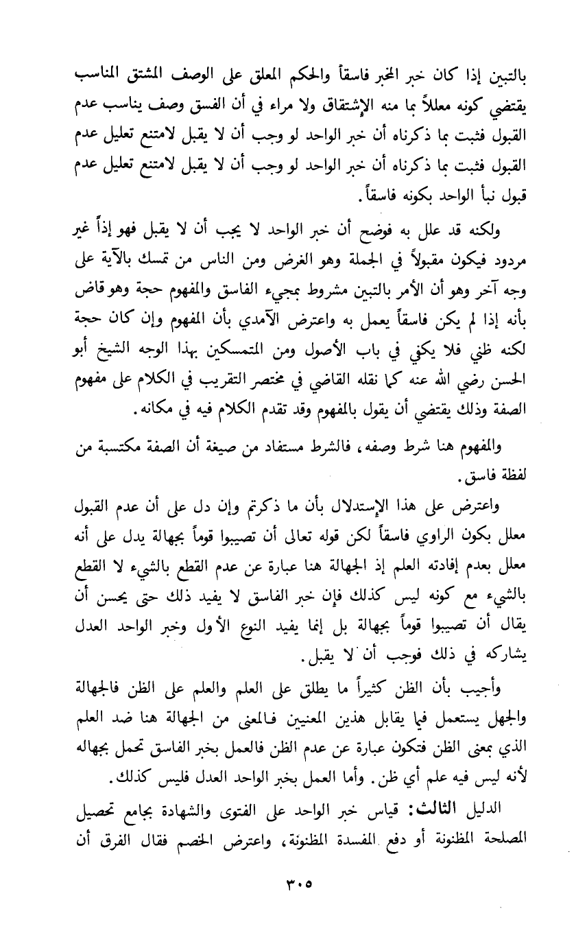 ولكنه قد علل به فوضح ان خبر الواحد لا يجب ان لا يقبل فهو اذا غير مردود فيكون مقبولا في الجملة وهو الغرض ومن الناس من تمسك بالآية على وجه آخر وهو ان الامر بالتبين مشروط بمجيء الفاسق والمفهوم حجة وهو قاض بانه اذا لم يكن فاسقا يعمل به واعترض الآمدي بان المفهوم وان كان حجة لكنه ظني فلا يكفي في باب الاصول ومن المتمسكين بهذا الوجه الشيخ ابو الحسن رضي الله عنه كما نقله القاضي في مختصر التقريب في الكلام على مفهوم الصفة وذلك يقتضي ان يقول بالمفهوم وقد تقدم الكلام فيه في مكانه.