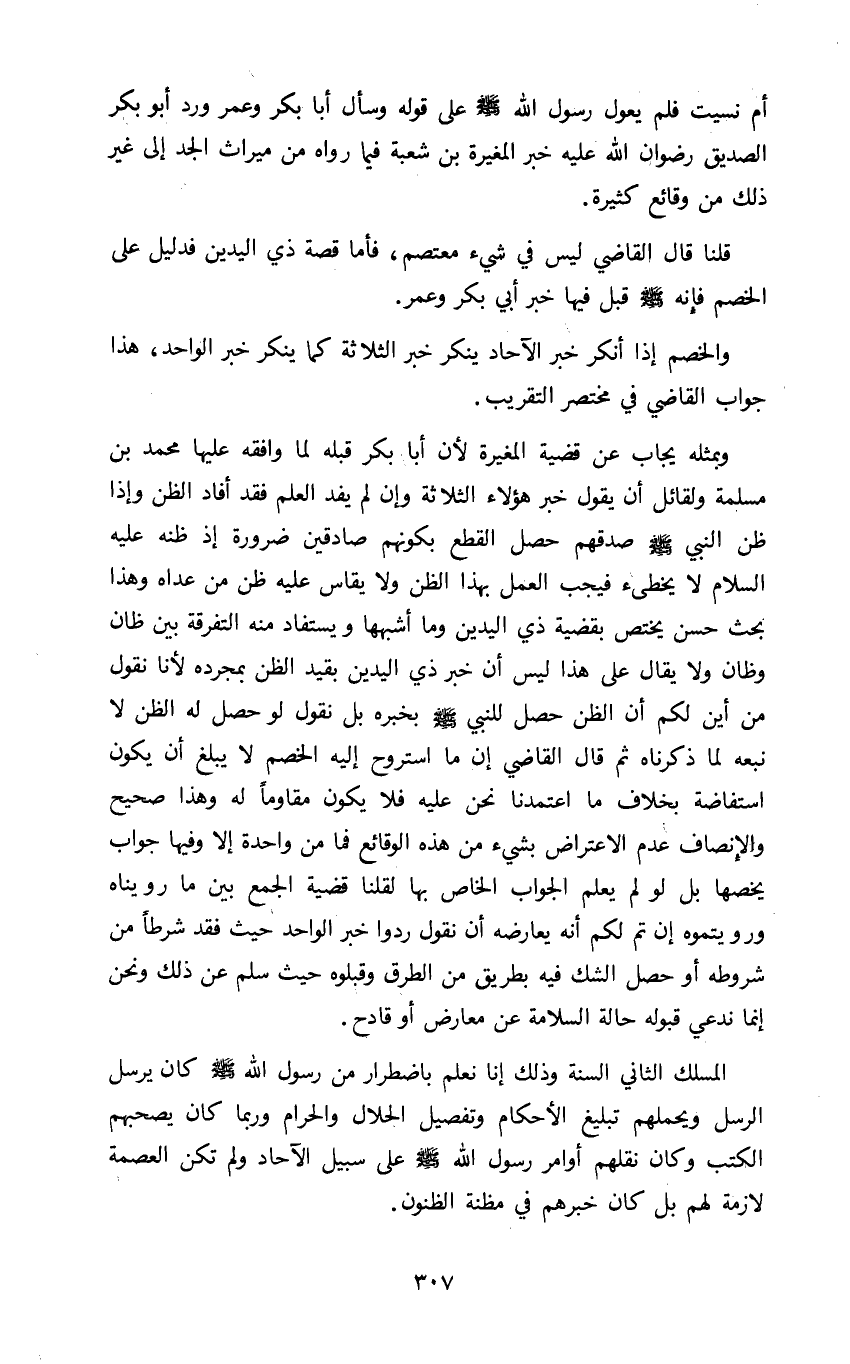 وبمثله يجاب عن قضية المغيرة لأن ابا بكر قبله لما وافقه عليها محمد بن مسلمة ولقائل ان يقول خبر هؤلاء الثلاثة وان لم يفد العلم فقد افاد الظن واذا ظن النبي صلى الله عليه وسلم صدقهم حصل القطع بكونهم صادقين ضرورة اذ ظنه عليه السلام لا يخطيء فيجب العمل بهذا الظن ولا يقاس عليه ظن من عداه وهذا بحث حسن يختص بقضية ذي اليدين واشبهها ويستفاد منه التفرقة بين ظان وظان ولا يقال على هذا ليس ان خبر ذي اليدين بقيد الظن بمجرده لأنا نقول من اين لكم الظن حصل للنبي صلى الله عليه وسلم بخبره بل نقول لو حصل له الظن لا نبعه لما ذكرناه ثم قال القاضي ان ما استروح اليه الخصم لا يبلغ ان يكون استفاضة بخلاف ما اعتمدنا نحن عليه فلا يكون مقاوما له وهذا صحيح والانصاف عدم الاعتراض بشيء من هذه الوقائع فما من واحدة الا وفيها جواب يخصها بل لو لم يعلم الجواب الخاص بها لقلنا قضية الجمع بين ما رويناه ورويتموه ان تم لكم انه يعارضه ان نقول ردوا خبر الواحد حيث فقد شرطا من شروطه او حصل الشك فيه بطريق من الطرق وقبلوه حيث سلم عن ذلك ونحن انما ندعي قبوله حالة السلامة عن معارض او قادح.