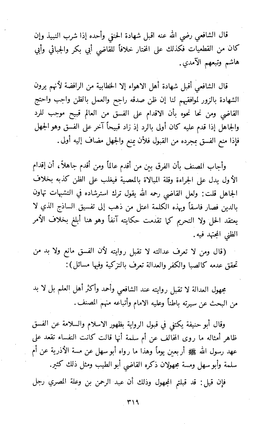 وقال أبو حنيفة يكتفى في قبول الرواية بظهور الإسلام والسلامة عن الفسق ظاهر أمثاله ما روى المخالف عن أم سلمة أنها قالت كانت النفساء تقعد على عهد رسول الله صلى الله عليه وسلم أربعين يوما وهذا ما رواه أبو سهل عن مسة الأذرية عن أم سلمة وأبو سهل ومسة مجهولان ذكره القاضي أبو الطيب ومثل ذلك كثير.