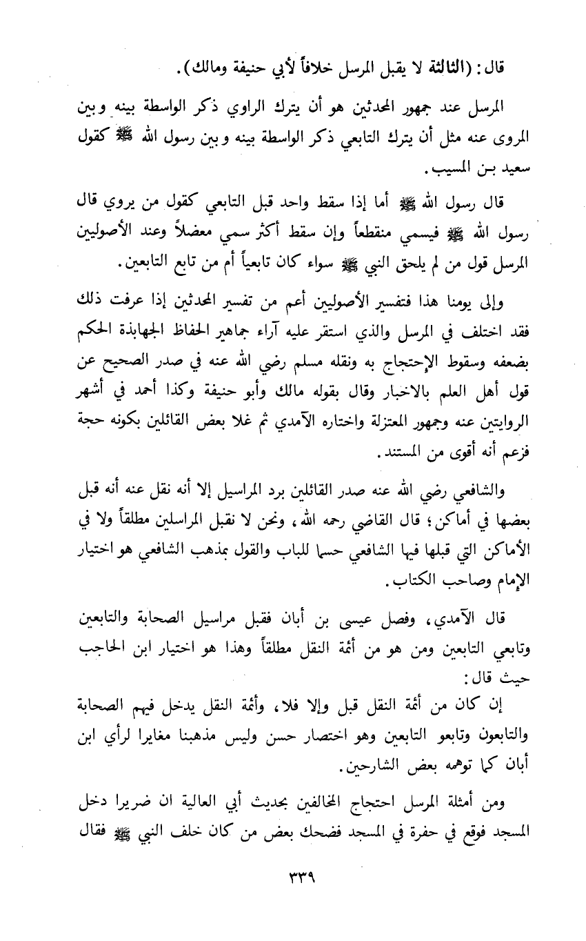 وإلى يومنا هذا فتفسير الأصوليين أعم من تفسير المحدثين إذا عرفت ذلك فقد اختلف في المرسل والذي استقر عليه آراء جماهير الحفاظ الجهابذة الحكم بضعفه وسقوط الاحتجاج به ونقله مسلم رضي الله عنه في صدر الصحيح عن قول أهل العلم بالاخبار وقال بقوله مالك وأبو حنيفة وكذا أحمد في أشهر الروايتين عنه وجمهور المعتزلة واختاره الآمدي ثم غلا بعض القائلين بكونه حجة فزعم أنه أقوى من المستند.
