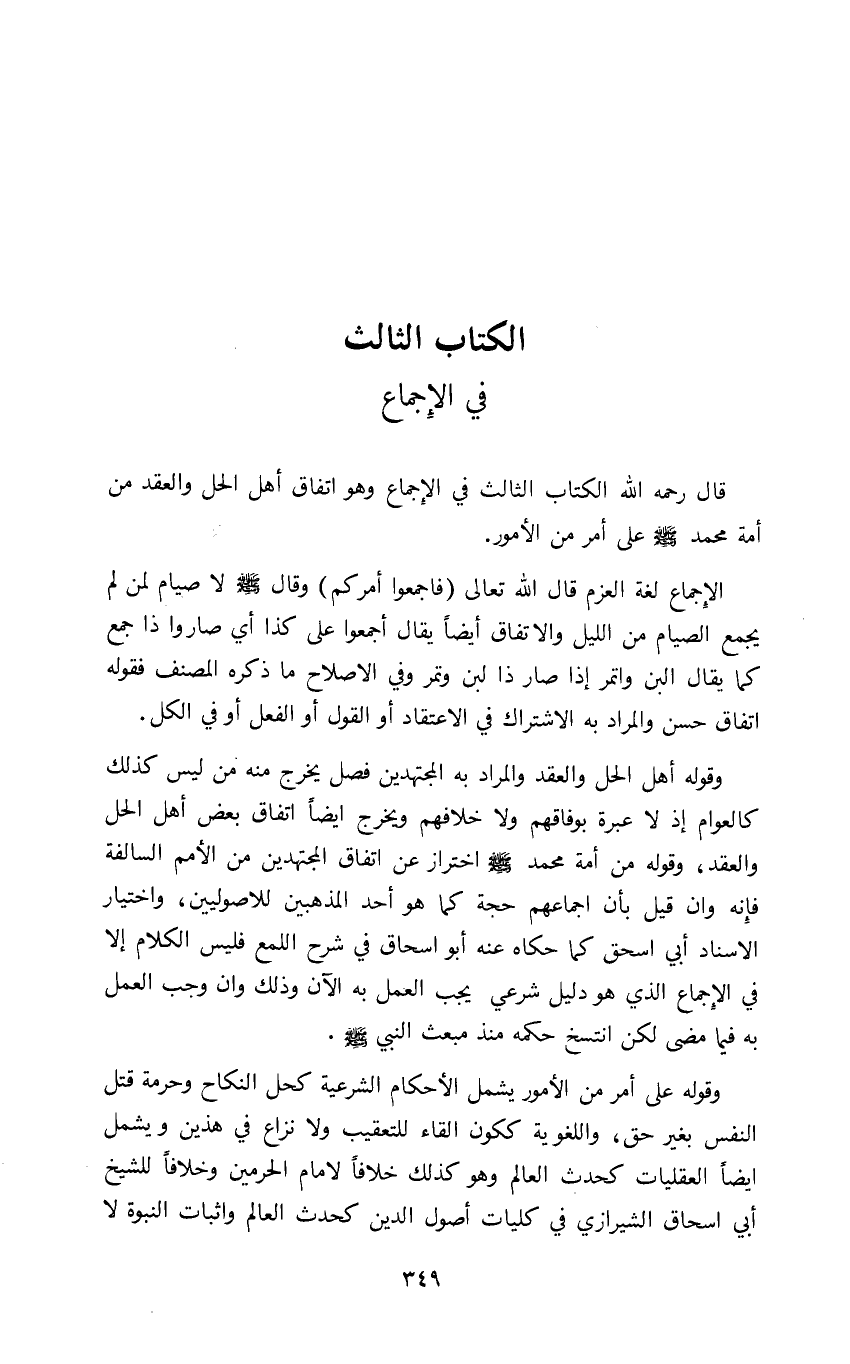 قال رحمه الله في الكتاب الثالث في الاجماع وهو اتفاق أهل الحل والعقد من أمة محمد صلى الله عليه وسلم على أمر من الأمور.