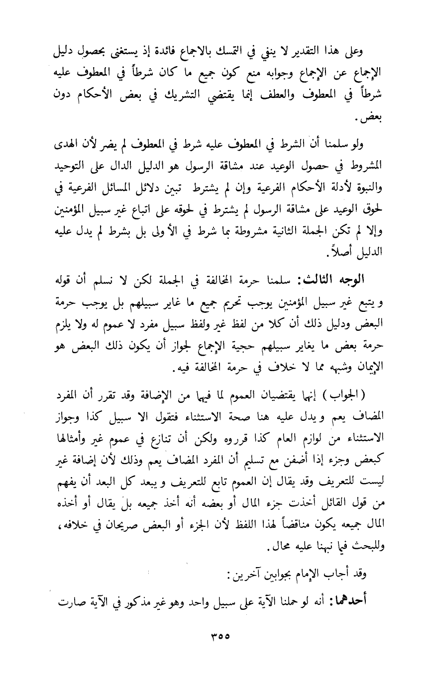 الوجه الثالث: سلمنا حرمة المخالفة في الجملة لكن لا نسلم أن قوله ويتبع غير سبيل المؤمنين يوجب تحريم جمع ما غاير سبيلهم بل يوجب حرمة البعض ودليل ذلك أن كلا من لفظ غير ولفظ سبيل مفرد لا عموم له ولا يلزم حرمة بعض ما يغاير سبيلهم حجية الإجماع لجواز أن يكون ذلك البعض هو الإيمان وشبهه مما لا خلاف في حرمة المخالفة فيه.