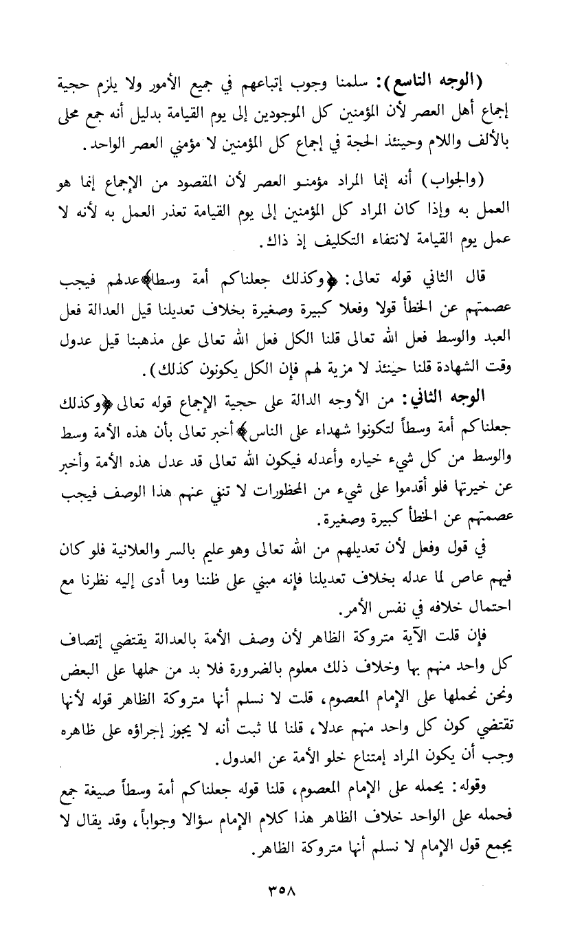 فإن قلت الآية متروكة الظاهر لأن وصف الأمة بالعدالة يقتضي إتصاف كل واحد منهم بها وخلاف ذلك معلوم بالضرورة فلا بد من حملها على البعض ونحن نحملها على الإمام المعصوم قلت لا نسلم أنها متروكة الظاهر قوله لأنها تقتضي كون كل واحد منهم عدلا قلنا لما ثبت أنه لا يجوز إجراؤه على ظاهره وجب أن يكون المراد إمتناع خلو الأمة عن العدول.