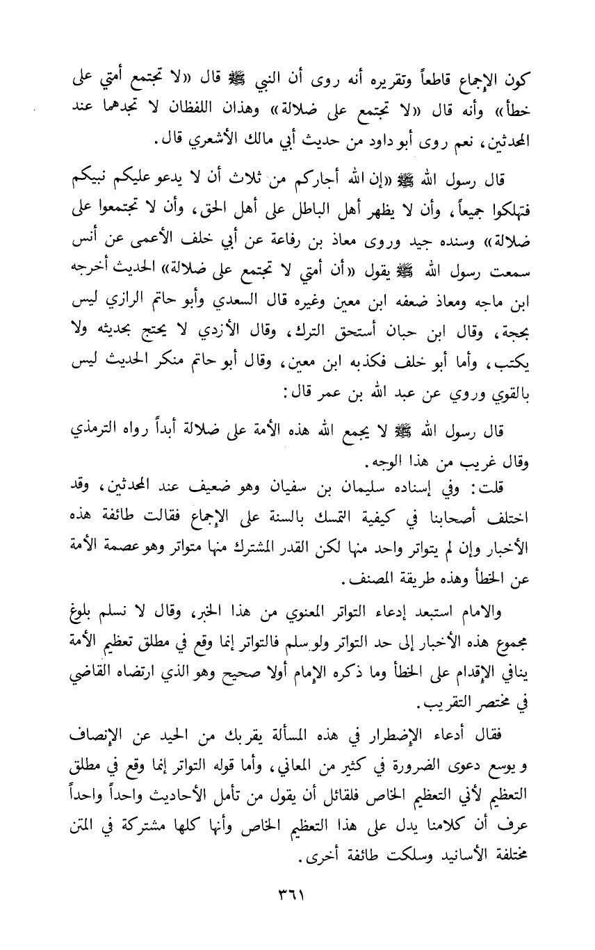 قال رسول الله صلى الله عليه وسلم: "إن الله أجاركم من ثلاث أن لا يدعو عليكم نبيكم فتهلكوا جميعا وأن لا يظهر أهل الباطل على أهل الحق وأن لا تجتمعوا على ضلالة" وسنده جيد وروى معاذ بن رفاعة عن أبي خلف الأعمى عن أنس سمعت رسول الله صلى الله عليه وسلم يقول: "أن أمتي لا تجتمع على ضلالة" الحديث أخرجه ابن ماجه ومعاذ ضعفه ابن معين وغيره قال السعدي وابو حاتم الرازي ليس بحجة وقال ابن حبان استحق الترك وقال الأزدي لا يحتج بحديثه ولا يكتب وأما أبو خلف فكذبه ابن معين وقال أبو حاتم منكر الحديث ليس بالقوي وروي عن عبد الله بن عمر قال: