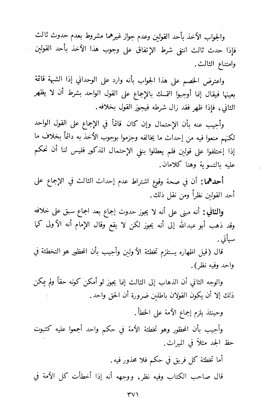 وأعترض الخصم على هذا الجواب بأنه وارد على الوحداني إذا الشبهة قائمة بعينها فيقال إنما اوجبوا التمسك بالإجماع على القول الواحد بشرط أن لا يظهر الثاني فإذا ظهر فقد زال شرطه فيجوز القول بخلافه.