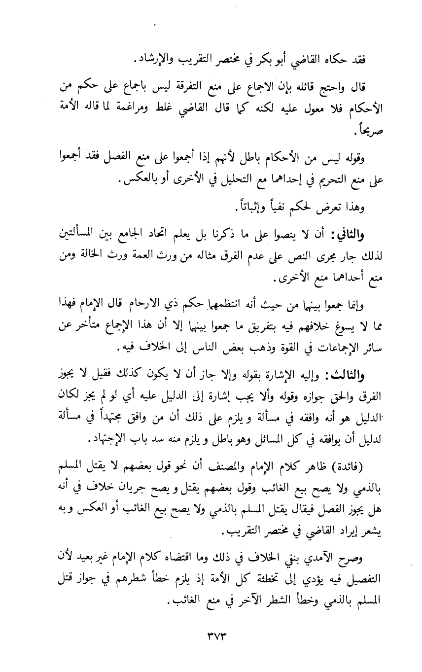 والثالث: وإليه الإشارة بقوله وإلا جاز ان لا يكون كذلك فقيل لا يجوز الفرق والحق جوازه وقوله وألا يجب إشارة إلى الدليل عليه أي لو لم يجز لكان الدليل هو أنه وافقه في مسألة ويلزم على ذلك أن من وافق مجتهدا في مسألة لدليل أن يوافقه في كل المسائل وهو باطل ويلزم منه سد باب الإجتهاد.