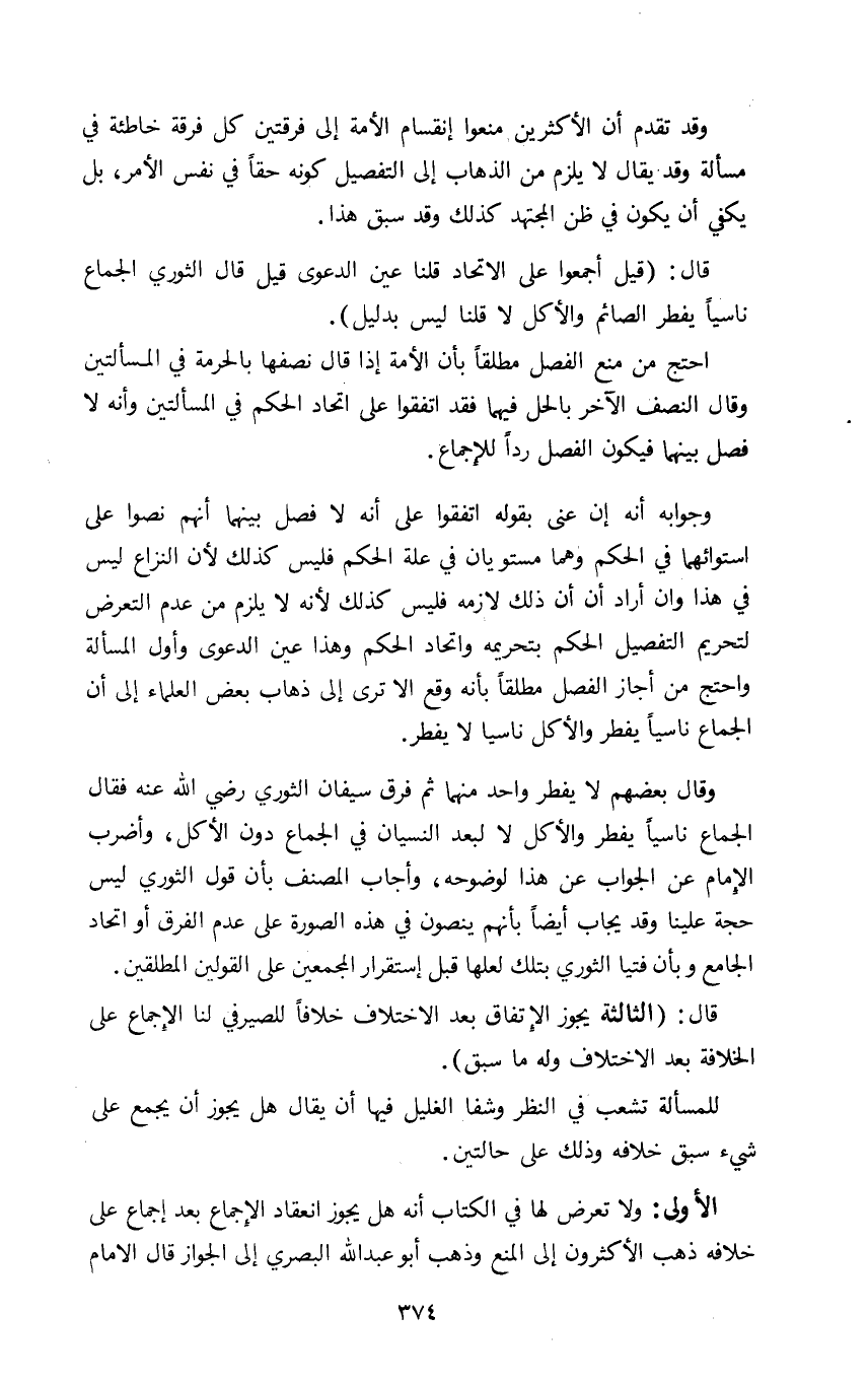 وقد تقدم أن الأكثرين منعوا إنقسام الأمة إلى فرقتين كل فرقة خاطئة في مسألة وقد يقال لا يلزم من الذهاب إلى التفصيل كونه حقا في نفس الأمر بل يكفي أن يكون في ظن المجتهد كذلك وقد سبق هذا.