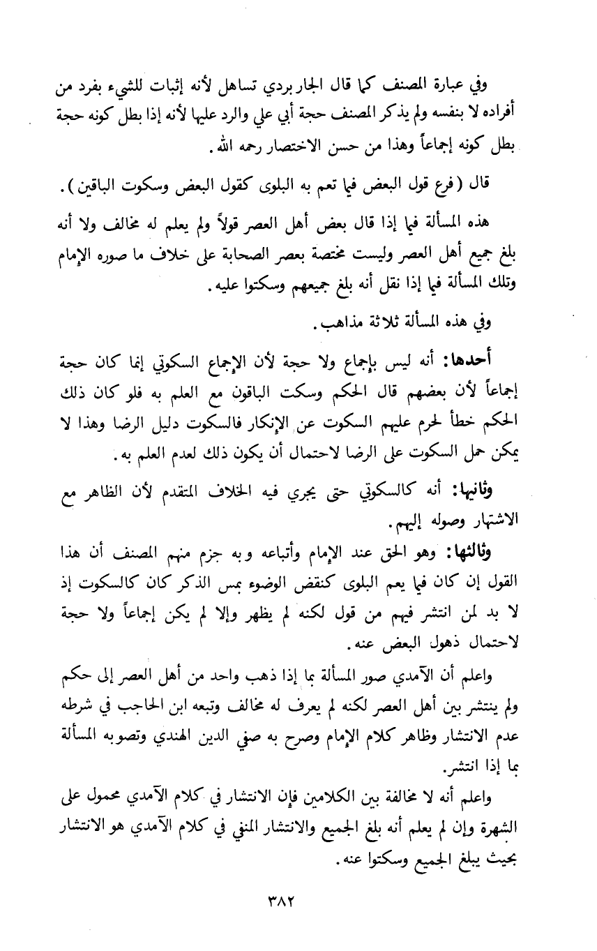 واعلم أنه لا مخالفة بين الكلامين فإن الانتشار في كلام الآمدي محمول على الشهرة وإن لم يعلم أنه بلغ الجميع والانتشار المنفي في كلام الآمدي هو الانتشار بحيث يبلغ الجميع وسكتوا عنه.
