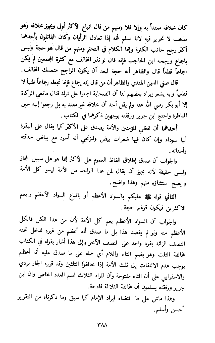 والجواب أن السواد الأعظم يعم كل الأمة لأن من عدا الكل فالكل الأعظم منه ولو لم يقصد هذا بل ما صدق أنه أعظم من غيره لدخل تحته النصف الزائد بفرد واحد على النصف الآخر وإلى هذا أشار بقوله في الكتاب مخالفة الثلث وهو بضم الثاء واللام أي حمله على ما صدق عليه أنه أعظم يوجب عدم الالتفات إلى ثلث الأمة إذا خالفوا الثلثين وقد قرره الجار بردي والاسفرايني على أن الثاء مفتوحة وأن المراد الثلاث اسم العدد الخاص وان ابن جرير ورفقته يسلمون أن مخالفة الثلاثة قادحة.