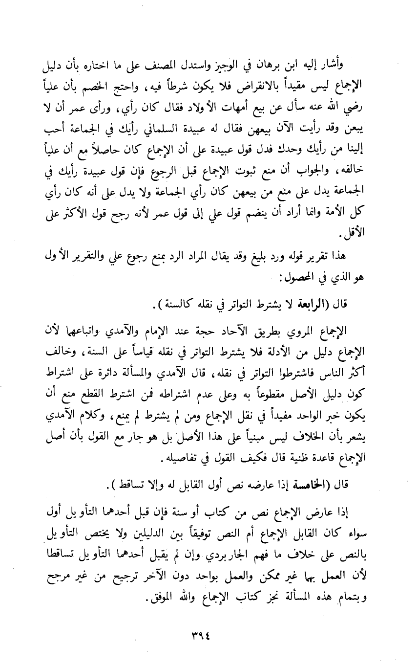 وأشار إليه ابن برهان في الوجيز واستدل المصنف على ما اختاره بأن دليل الإجماع ليس مقيدا بالإنقراض فلا يكون شرطا فيه واحتج الخصم بأن عليا رضي الله عنه سأل عن بيع أمهات الأولاد فقال كان رأي ورأى عمر أن لا يبعن وقد رأيت الآن بيعهن فقال له عبيدة السلماني رأيك في الجماعة أحب إلينا من رأيك وحدك فدل قول عبيدة على أن الإجماع كان حاصلا مع أن عليا خالفه والجواب أن منع ثبوت الإجماع قبل الرجوع فإن قول عبيدة رأيك في الجماعة يدل على منع بيعهن كان رأي الجماعة ولا يدل على أنه كان رأي كل الأمة وأنما أراد أن ينضم قول علي إلى قول عمر لأنه رجح قول الأكثر على الأقل.