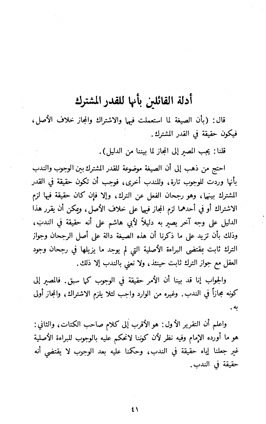 احتج من ذهب إلى أن الصيغة موضوعة للقدر المشترك بين الوجوب والندب بأنها وردت للوجوب تارة وللندب أخرى فوجب ان تكون حقيقة في القدر المشترك بينهما وهو رجحان الفعل عن الترك وإلا فان كان حقيقة فيها لزم الاشتراك أو في أحدهما لزم المجاز فيهما على خلاف الأصل ويمكن ان يقرر هذا الدليل على وجه آخر يصير به دليلا لأبي هاشم على أنه حقيقة في الندب وذلك بان تزيد على ما ذكرنا أن هذه الصيغة دالة على أصل الرجحان وجواز الترك ثابت بمقتضى البراءة الأصلية التي لم يوجد ما يزيلها في رجحان وجود العقل مع جواز الترك ثابت حينئذ ولا نعني بالندب إلا ذلك.