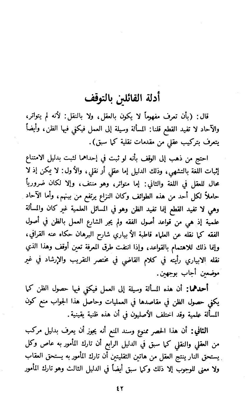 احتج من ذهب إلي الوقف بأنه لو ثبت في إحداهما لثبت بدليل الامتناع إثبات اللغة بالتشهي وذلك الدليل إما عقلي أو نقلي والأول لا يمكن إذ لا محال للعقل في اللغة والثاني إما متواتر وهو منتف وإلا لكان ضروريا حاملا لكل أحد من هذه الطوائف وكان النزاع يرتفع من بينهم واما الآحاد وهي لا تفيد القطع إنما تفيد الظن وهو في المسائل العلمية غير كان والمسألة علمية إذ هي من قواعد أصول الفقه ولم يجر الشارع العمل بالظن في أصول الفقه كما نقله عن العلماء قاطبة الابياري شارح البرهان حكاه عنه القرافي وانما ذلك للاهتمام بالقواعد وإذا انتفت طرق المعرفة تعين أوقف وهذا الذي نقله الأبياري رأيته في كلام القاضي في مختصر التقريب والإرشاد في غير موضعين أجاب بوجهين.