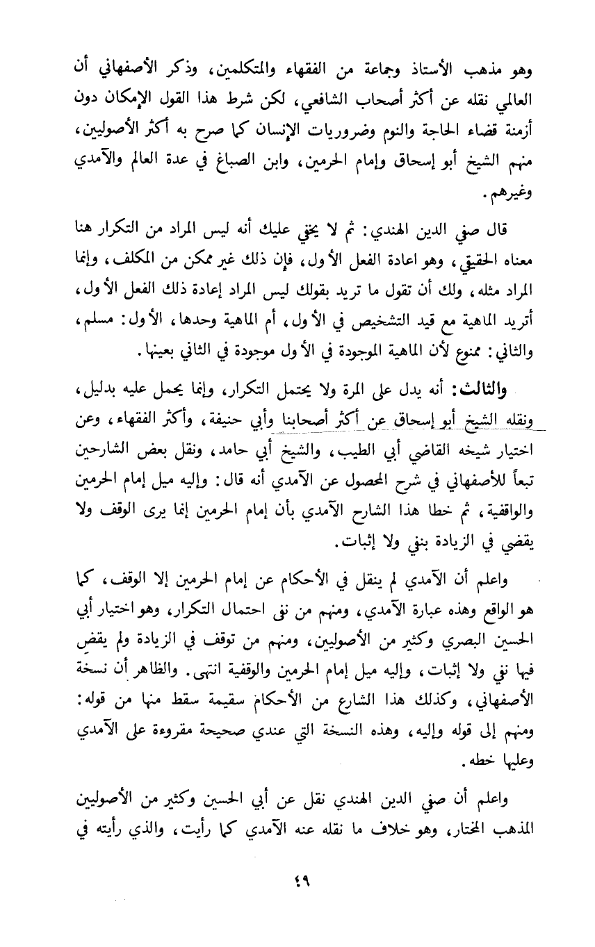 واعلم أن صفي الدين الهندي نقل عن أبي الحسين وكثير من الاصوليين المذهب المختار وهو خلاف ما نقله عنه الآمدي كما رأيت والذي رأيته في