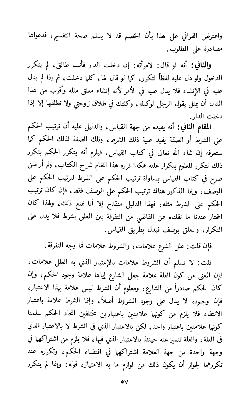 واعترض القرافي على هذا بان الخصم قد لا يسلم صحة التقسيم فدعواها مصادرة على المطلوب.