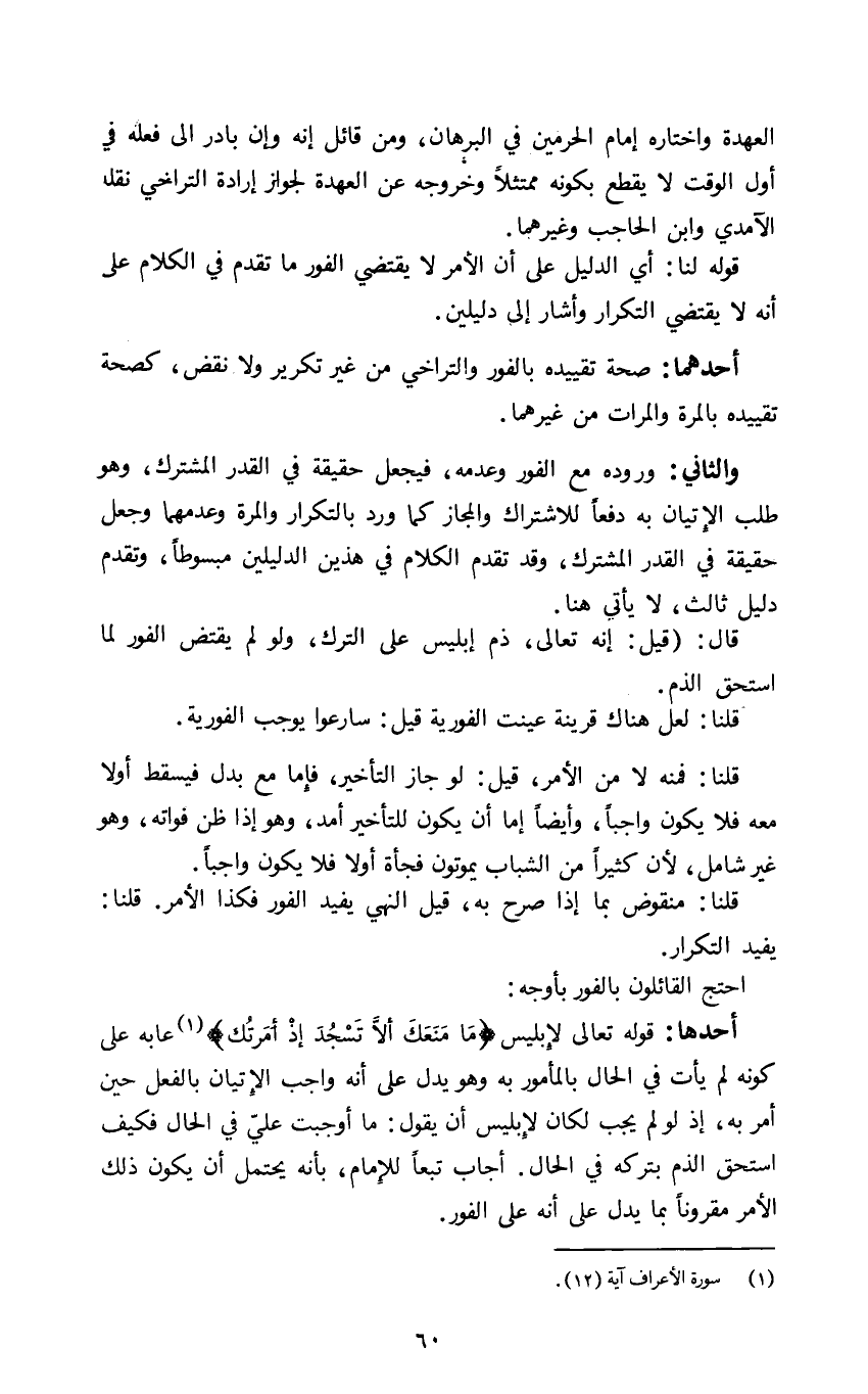 أحدها: قوله تعالى لإبليس: {مَا مَنَعَكَ أَلَّا تَسْجُدَ إِذْ أَمَرْتُكَ} 1 عابه على كونه لم يأت في الحال بالمأمور به وهو يدل على أنه واجب الإتيان بالفعل حين أمر به إذ لو لم يجب لكان لإبليس أن يقول ما أوجبت على في الحال فكيف استحق الذم بتركه في الحال أجاب تبعا للإمام بأنه يحتمل ان يكون ذلك الأمر مقرونا بما يدل على أنه على الفور.