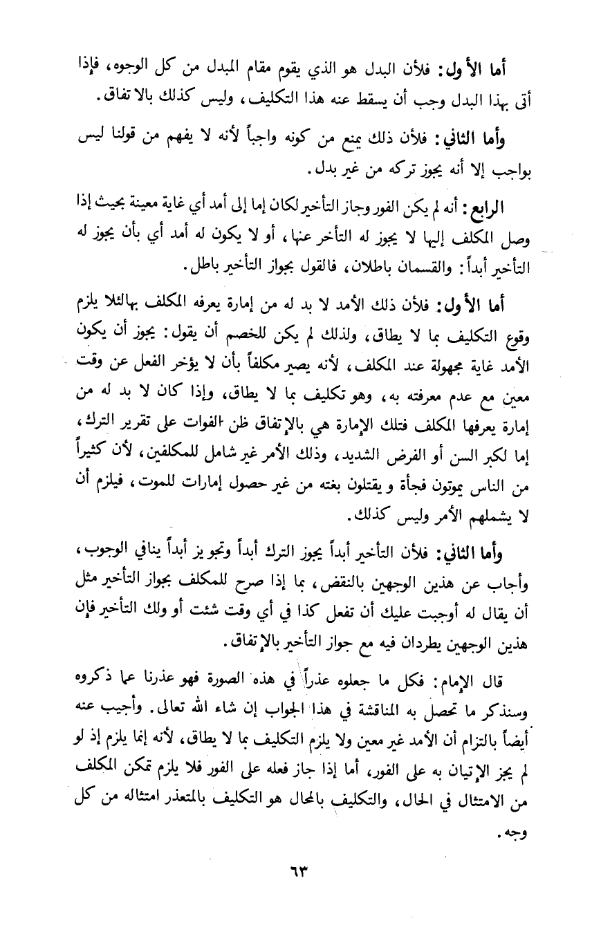 قال الإمام: فكل ما جعلوه عذرا في هذه الصورة فهو عندنا عما ذكروه وسنذكر ما تحصل به المناقشة في هذا الجواب إن شاء الله تعالى وأجيب عنه أيضا بالتزام أن الأمد غير معين ولا يلزم التكليف بما لا يطاق لأنه إنما يلزم إذ لو لم يجز الإتيان به على الفور أما إذا جاز فعله على الفور فلا يلزم تمكن المكلف من الامتثال في الحال والتكليف بالمحال هو التكليف بالمتعذر امتثاله من كل وجه.