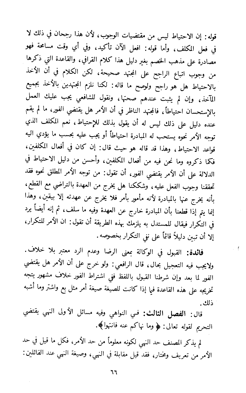 قوله: إن الإحتياط ليس من مقتضيات الوجوب لأن هذا رجحان في ذلك لا في فعل المكلف وأما قوله افعل الآن تأكيد وفي أي وقت مسامحة فهو مصادرة على مذهب الخصم بغير دليل هذا كلام القرافي والقاعدة التي ذكرها من وجوب اتباع الراجح على المجتهد صحيحة لكن الكلام في أن الأخذ بالاحتياط هل هو راجح ولو صح ما قاله لكنا نلزم المجتهدين بالأخذ بجميع المآخذ وإن لم يثبت عندهم صحتها ونقول للشافعي يجب عليك العمل بالاستحسان احتياطا فالمجتهد الناظر في أن الأمر هل يقتضي الفور ما لم يقم عنده دليل على ذلك ليس له أن يقول بذلك للاحتياط نعم المكلف الذي توجه الأمر نحوه يستحب له المبادرة احتياطا أو يجب عليه بحسب ما يؤدي إليه قواعد الاحتياط وهذا قد قاله هو حيث قال إن كان في أفعال المكلفين فكما ذكروه وما نحن فيه من أفعال المكلفين وأحسن من دليل الاحتياط في الدلالة على أن الأمر يقتضي الفور أن تقول من توجه الأمر المطلق نحوه فقد تحققنا وجوب الفعل عليه وشككنا هل يخرج من العهدة بالتراضي مع القطع بأنه يخرج عنها بالمبادرة لأنه مأمور بأمر فلا يخرج عن عهدته الا بيقين وهذا إنما تم إذا قطعنا بأن المبادرة خارج عن العهدة وفيه ما سلف ثم أنه أيضا يرد في التكرار فيقال للمستدل به يلزمك بهذه الطريقة أن تقول أن الأمر للتكرار إلا أن تبين دليلا قائما على نفي التكرار بخصوصه.