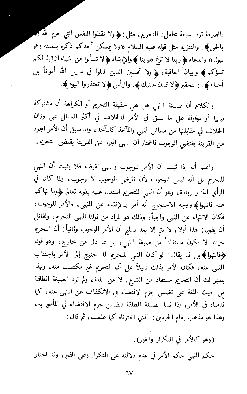واعلم أنه إذا ثبت أن الامر للوجوب والنهي نقيضه فلا يثبت ان النهي للتحريم بل أنه ليس للوجوب لأن نقيض الوجوب لا وجوب ولما كان في الرأي المختار زيادة وهو ان النهي للتحريم استدل عليه بقوله تعالى: {وَمَا نَهَاكُمْ عَنْهُ فَانْتَهُوا} ووجه الاحتجاج انه أمر بالانتهاء عن المنهى والأمر للوجوب فكان الانتهاء عن المنهى واجبا وذلك هو المراد من قولنا النهي للتحريم ولقائل أن يقول هذا أولا لا يتم إلا بعد تسليم أن الأمر للوجوب وثانيا أن التحريم حينئذ لا يكون مستفادا من صيغة النهي بل بما دل من خارج وهو قوله: {فَانْتَهُوا} بل قد يقال لو كان النهي للتحريم لما احتيج إلى الأمر باجتناب المنهي عنه فكان الأمر بذلك دليلا على أن التحريم غير مكتسب منه وبهذا يظهر لك أن التحريم مستفاد من الشرع لا من اللغة ولم ترد الصيغة المطلقة من حيث اللغة على تضمن جزم الاقتضاء في الإنكفاف عن المنهي عنه كما قدمناه في الأمر إذا قلنا الصيغة المطلقة تتضمن جزم الاقتضاء في المأمور به وهذا هو مذهب إمام الحرمين الذي اخترناه كما علمت ثم قال: