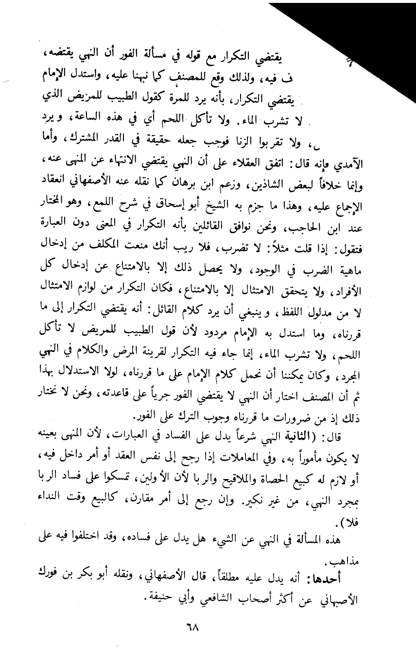 الإمام أن النهي لا يقتضي التكرار مع قوله في مسألة الفور أن النهي يقتضه وإبهامه عدم الخلاف فيه ولذلك وقع للمصنف كما نبهنا عليه واستدل الإمام على أن النهي لا يقتضي التكرار بأنه يرد للمرة كقول الطبيب للمريض الذي يشرب الدواء لا تشرب الماء ولا تأكل اللحم أي في هذه الساعة ويرد للتكرار مثل: {وَلا تَقْرَبُوا الزِّنَى} فوجب جعله حقيقة في القدر المشترك وأما الآمدي فإنه قال اتفق العقلاء على أن النهي يقتضي الانتهاء عن المنهى عنه وإنما خلافا لبعض الشاذين وزعم ابن برهان كما نقله عنه الاصفهاني انعقاد الاجماع عليه وهذا ما جزم به الشيخ أبو اسحاق في شرح اللمع وهو المختار عند ابن الحاجب ونحن نوافق القائلين بأنه التكرار في المعنى دون العبارة فتقول إذا قلت مثلا لا تضرب فلا ريب أنك منعت المكلف من إدخال ماهية الضرب في الوجود ولا يحصل ذلك إلا بالإمتناع عن إدخال كل الأفراد ولا يتحقق الإمتثال إلا بالإمتناع فكان التكرار من لوازم الإمتثال لا من مدلول اللفظ وينبغي أن يرد كلام القائل أنه يقتضي التكرار إلى ما قررناه وما استدل به الإمام مردود لأن قول الطبيب للمريض لا تأكل اللحم ولا تشرب الماء إنما جاء فيه التكرار لقرينة المرض والكلام في النهي المجرد وكان يمكننا أن نحمل كلام الإمام على ما قررناه لولا الإستدلال بهذا ثم إن المصنف اختار ان النهي لا يقتضي الفور جريا على قاعدته ونحن لا نختار ذلك إذ من ضرورات ما قررناه وجوب الترك على الفور.