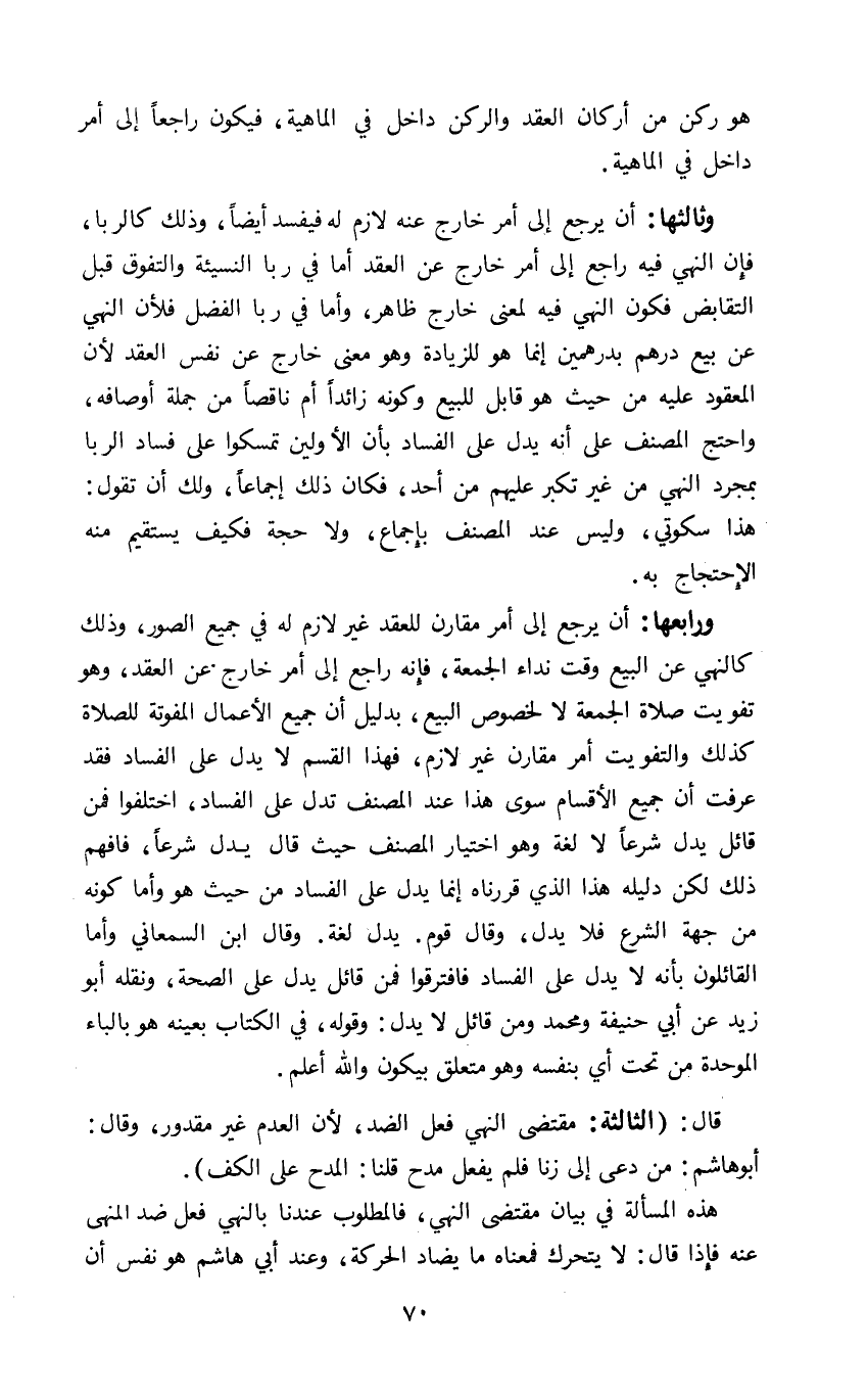 وثالثها: أن يرجع إلى أمر خارج عنه لازم له فيفسد أيضا وذلك كالربا فإن النهي فيه راجع إلى أمر خارج عن العقد أما في ربا النسيئة والتفوق قبل التقابض فكون النهي فيه لمعنى خارج ظاهر وأما في ربا الفضل فلأن النهي عن بيع درهم بدرهمين إنما هو للزيادة وهو معنى خارج عن نفس العقد لأن المعقود عليه من حيث هو قال للبيع وكونه زائدا أم ناقصا من جملة أوصافه واحتج المصنف على أنه يدل على الفساد بأن الأولين تمسكوا على فساد الربا بمجرد النهي من غير تكبر عليهم من أحد فكان ذلك إجماعا ولك أن تقول هذا سكوتي وليس عند المصنف بإجماع ولا حجة فكيف يستقيم منه الإحتجاج به.