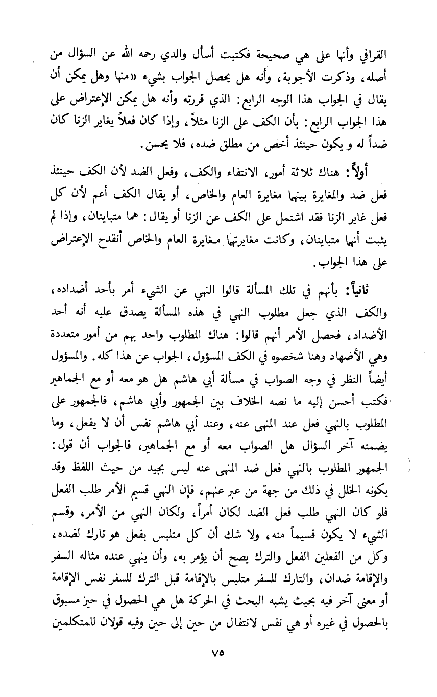 ثانيا: بأنهم في تلك المسألة قالوا النهي عن الشيء أمر بأحد أضداده والكف الذي جعل مطلوب النهي في هذه المسألة يصدق عليه انه أحد الأضداد فحصل الأمر انهم قالوا هناك المطلوب واحد بهم من أمور متعددة وهي الاضطهاد وهنا شخصوه في الكف المسؤول الجواب عن هذا كله والمسؤول ايضا النظر في وجه الصواب في مسألة أبى هاشم هل هو معه أو مع الجماهير فكتب احسن إليه ما نصه الخلاف بين الجمهور وأبى هاشم فالجمهور على المطلوب بالنهي فعل عند المنهي عنه وعند أبى هاشم نفس ان لا يفعل وما يضمنه آخر السؤال هل الصواب معه أو مع الجماهير فالجواب ان قول الجمهور المطلوب بالنهي فعل ضد النهى عنه ليس بجيد من حيث اللفظ وقد يكونه الخلل في ذلك من جهة من عبر عنهم فإن النهي قسيم الأمر طلب الفعل فلو كان النهي طلب فعل الضد لكان أمرا وكان النهي من الأمر وقسم الشيء لا يكون قسيما منه ولا شك ان كل متلبس بفعل هو تارك لضده وكل من الفعلين الفعل والترك يصح ان يؤمر به وان ينهي عنده مثاله السفر والإقامة ضدان والتارك للسفر متلبسين بالإقامة قبل الترك للسفر نفس الإقامة أو معنى آخر فيه بحيث يشبه البحث في الحركة هل هي الحصول في حيز مسبوق بالحصول في غيره أو هي نفس لانتقال من حين إلى حين وفيه قولان للمتكلمين