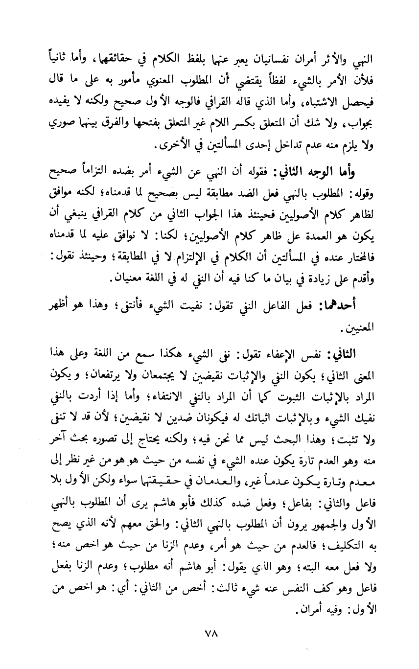 الثاني: نفس الإعفاء تقول: نفي الشيء هكذا سمع من اللغة وعلى هذا المعنى الثاني يكون النفي والإثبات نقيضين لا يجتمعان ولا يرتفعان ويكون المراد بالإثبات الثبوت كما أن المراد بالنفي الانتفاء واما إذا أردت بالنفي نفيك الشيء وبالإثبات إثباتك له فيكونان ضدين لا نقيضين لأن قد لا تنفى ولا تثبت وهذا البحث ليس مما نحن فيه ولكنه يحتاج إلى تصوره بحث آخر منه وهو العدم تارة يكون عنده الشيء في نفسه من حيث هو هو من غير نظر إلى معدم وتارة يكون عدما غير والعدمان في حقيقتهما سواء ولكن الأول بلا فاعل والثاني بفاعل وفعل ضده كذلك فأبو هاشم يرى ان المطلوب بالنهي الأول والجمهور يرون ان المطلوب بالنهي الثاني والحق معهم لأنه الذي يصح به التكليف فالعدم من حيث هو أمر وعدم الزنا من حيث هو أخص منه ولا فعل معه البته وهو الذي يقول أبو هاشم انه مطلوب وعدم الزنا بفعل فاعل وهو كف النفس عنه شيء ثالث أخص من الثاني أي هو أخص من الأول وفيه أمران