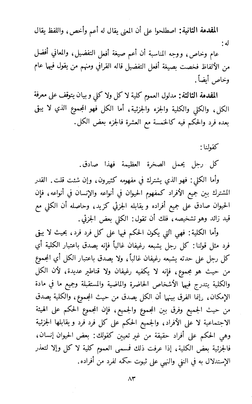 وأما الكلية: فهي التي يكون الحكم فيها على كل فرد فرد بحيث لا يبقى فرد مثل قولنا: كل رجل يشبعه رغيفان غالبا فإنه يصدق باعتبار الكلية أي كل رجل على حدته يشبعه رغيفان غالبا ولا يصدق باعتبار الكل أي المجموع من حيث هو مجموع فانه لا يكفيه رغيفان ولا قناطير عديدة لأن الكل والكلية يتدرج فيهما الأشخاص الحاضرة والماضية والمستقبلة وجميع ما في مادة الإمكان وانما الفرق بينهما ان الكل يصدق من حيث المجموع والكلية يصدق من حيث الجميع وفرق بين المجموع والجميع فإن المجموع الحكم على الهيئة الاجتماعية لا على الأفراد والجميع الحكم على كل فرد فرد ويقابلها الجزئية وهي الحكم على أفراد حقيقة من غير تعيين كقولك بعض الحيوان إنسان فالجزئية بعض الكلية إذا عرفت ذلك فمسمى العموم كلية لا كل وإلا لتعذر الاستدلال به في النفي والنهي على ثبوت حكمه لفرد من أفراده.