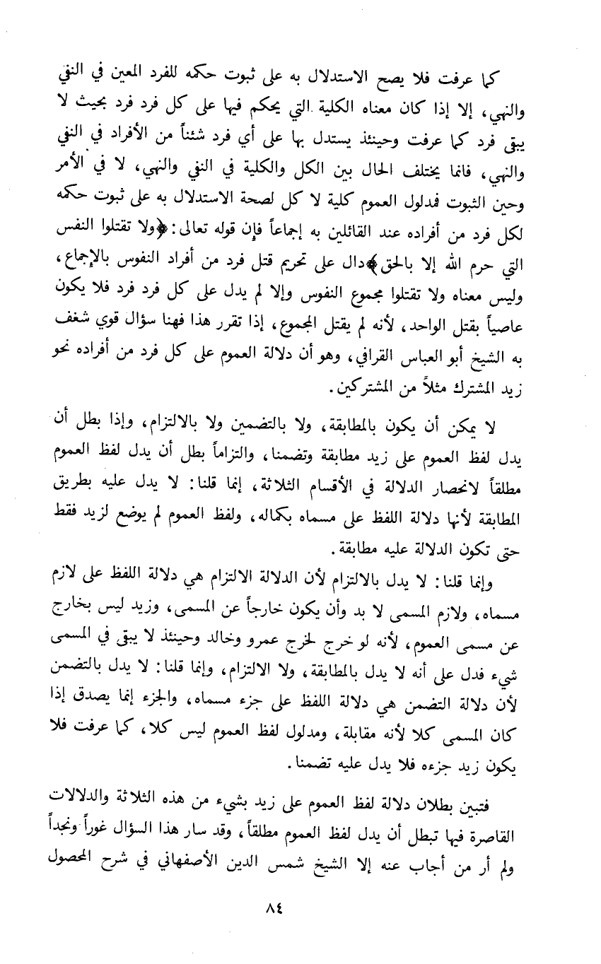 كما عرفت فلا يصح الاستدلال به على ثبوت حكمه للفرد المعين في النفي والنهي الا إذا كان معناه الكلية التي يحكم فيها على كل فرد بحيث لا يبقى فرد كما عرفت وحينئذ يستدل بها على أي فرد شئنا من الأفراد في النفي والنهي فإنما يختلف الحال بين الكل والكلية في النفي والنهي لا في الامر وحين الثبوت فمدلول العموم كلية لا كل لصحة الاستدلال به على ثبوت حكمه لكل فرد من أفراده عند القائلين به اجماعا فإن قوله تعالى: {وَلا تَقْتُلُوا النَّفْسَ الَّتِي حَرَّمَ اللَّهُ إِلَّا بِالْحَقِّ} دال على تحريم قتل فرد من أفراد النفوس بالاجماع وليس معناه ولا تقتلوا مجموع النفوس وإلا لم يدل على كل فرد فرد فلا يكون عاصيا بقتل الواحد ألانه لم يقتل المجموع إذا تقرر هذا فهنا سؤال قوي شغف به الشيخ أبو العباس القرافي وهو ان دلالة العموم على كل فرد من أفراده نحو زيد المشترك مثلا من المشتركين.