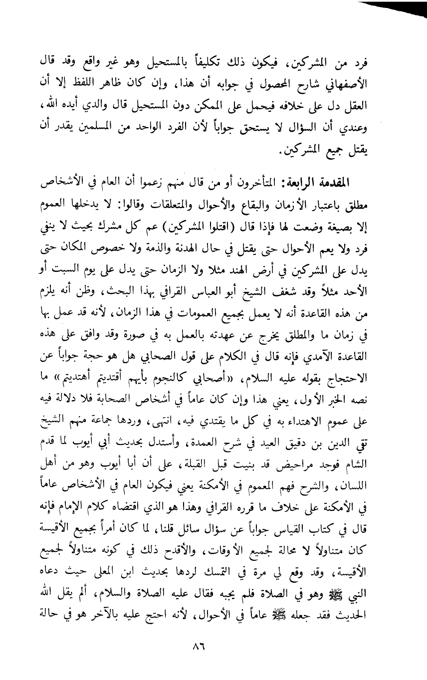 المقدمة الرابعة: المتأخرون أو من قال منهم زعموا ان العام في الأشخاص مطلق باعتبار الأزمان والبقاع والأحوال والمتعلقات وقالوا لا يدخلها العموم الا بصيغة وضعت لها فإذا قال اقتلو المشركين عم كل مشرك بحيث لا ينفي فرد ولا يعم الأحوال حتى يقتل في حال الهدنة والذمة ولا خصوص المكان حتى يدل على المشركين في ارض الهند مثلا ولا الزمان حتى يدل على يوم السبت أو الأحد مثلا وقد شغف الشيخ أبو العباس القرافي بهذا البحث وظن انه يلزم من هذه القاعدة انه لا يعمل بجميع العمومات في هذا الزمان لأنه قد عمل بها في زمان ما والمطلق يخرج عن عهدته بالعمل به في صورة وقد وافق على هذه القاعدة الآمدي فانه قال في الكلام على قول الصحابي هل هو حجة جوابا عن الاحتجاج بقوله عليه السلام: "أصحابي كالنجوم بأيهم اقتديتم اهتديتم" ما نصه الخبر الأول يعني هذا وان كان عاما في أشخاص الصحابة فلا دلالة فيه على عموم الاهتداء به في كل ما يقتدي فيه انتهى وردها جماعة منهم الشيخ تقي الدين بن دقيق العيد في شرح العمدة واستدل بحديث أبي أيوب لما قدم الشام فوجد مراحيض قد بنيت قبل القبلة على ان أبا أيوب وهو من أهل اللسان والشرح فهم المعموم في الأمكنة يعني فيكون العام في الأشخاص عاما في الأمكنة على خلاف ما قرره القرافي وهذا هو الذي اقتضاه كلام الإمام فانه قال في كتاب القياس جوابا عن سؤال سائل قلنا لما كان أمرا بجميع الاقيسة كان متناولا لا محالة لجميع الأوقات والأقدح ذلك في كونه متناولا لجميع الاقيسة وقد وقع لي مرة في التمسك لردها بحديث ابن المعلى حيث دعاه النبي صلى الله عليه وسلم وهو في الصلاة فلم يجبه فقال عليه الصلاة والسلام: "ألم يقل الله" الحديث فقد جعله صلى الله عليه وسلم عاما في الأحوال لأنه احتج عليه بالآخر هو في حالة