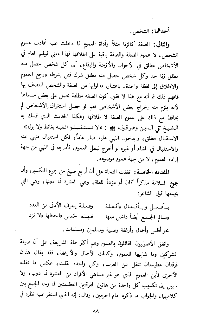 والثاني: الصفة كالزنا مثلا وأداة العموم لما دخلت عليه أفادت عموم الشخص لا عموم الصفة والصفة باقية على إطلاقها فهذا معنى قولهم العام في الأشخاص مطلق في الأحوال والأزمنة والبقاع أي كل شخص حصل منه مطلق زنا حد وكل شخص حصل منه مطلق شرك قتل بشرطه ورجع العموم والاطلاق إلى لفظة واحدة باعتباره مدلوليها من الصفة والشخص المتصف بها فافهم ذلك ثم انه مع هذا لا نقول كون الصفة مطلقة يحمل على بعض مسماها لأنه يلزم منه إخراج بعض الأشخاص نعم لو حصل استغراق الأشخاص لم يحافظ مع ذلك على عموم الصفة لا طلاقها وهكذا الحديث الذي تمسك به الشيخ تقي الدين وهو قوله صلى الله عليه وسلم: "لا تستقبلوا القبلة بغائط ولا بول" الاستقبال مطلق وبدخول النهي عليه صار عاما فكل استقبال منهي عنه والاستقبال في الشام أو غيره لو أخرج لبطل العموم فأدرجه في النهي من جهة إرادة العموم لا من جهة عموم موضوعه.