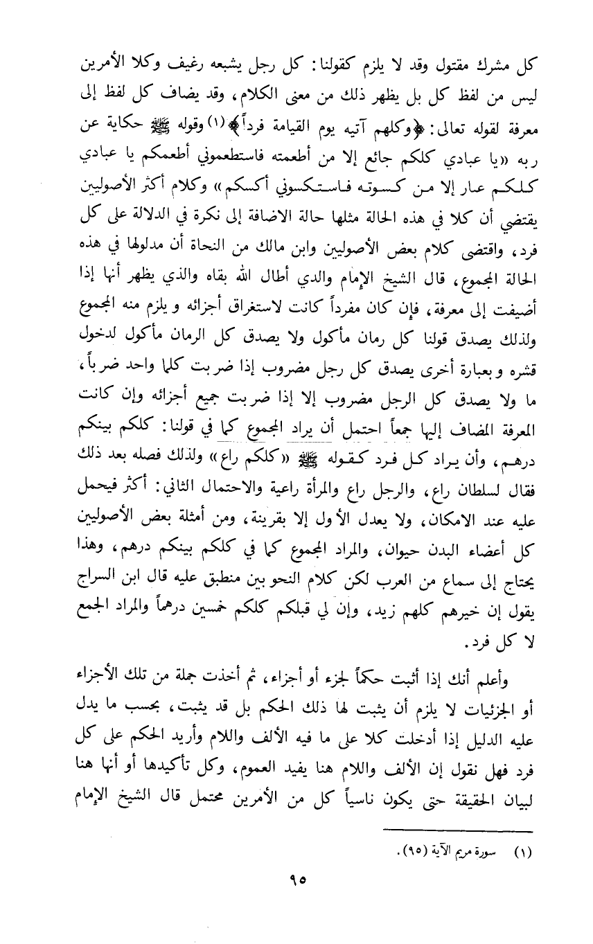 كل مشرك مقتول وقد لا يلزم كقولنا كل رجل يشبعه رغيف وكلا الأمرين ليس من لفظ كل بل يظهر ذلك من معنى الكلام وقد يضاف كل لفظ إلى معرفة لقوله تعالى: {وَكُلُّهُمْ آتِيهِ يَوْمَ الْقِيَامَةِ فَرْداً} 1 وقوله صلى الله عليه وسلم حكاية عن ربه: "يا عبادي كلكم جائع الا من أطعمته فاستطعموني أطعمكم يا عبادي كلكم عار الا من كسوته فاستكسوني اكسكم" وكلام اكثر الأصوليين يقتضي ان كلا في هذه الحالة مثلها حالة الإضافة إلى نكرة في الدلالة على كل فرد واقتضى كلام بعض الاصوليين وابن مالك من النحاة ان مدلولها في هذه الحالة المجموع قال الشيخ الإمام والدي أطال الله بقاه والذي يظهر أنها إذا أضيفت إلى معرفة فإن كان مفردا كانت لاستغراق أجزائه ويلزم منه المجموع ولذلك يصدق قولنا كل رمان مأكول ولا يصدق كل الرمان مأكول لدخول قشره وبعبارة أخرى يصدق كل رجل مضروب إذا ضربت كلما واحد ضربا ما ولا يصدق كل الرجل مضروب الا إذا أضربت جميع أجزائه وان كانت المعرفة المضاف إليها جمعا احتمل ان يراد المجموع كما في قولنا كلكم بينكم درهم وان يراد كل فرد كقوله صلى الله عليه وسلم: "كلكم راع" ولذلك فصله بعد ذلك فقال لسلطان راع والرجل راع والمرأة راعية والاحتمال الثاني: اكثر فيحمل عليه عند الإمكان ولا يعدل الأول الا بقرينة ومن أمثلة بعض الاصوليين كل أعضاء البدن حيوان والمراد المجموع كما في كلكم بينكم درهم وهذا يحتاج إلى سماع من العرب لكن كلام النحو بين منطبق عليه قال ابن السراج يقول ان خيرهم كلهم زيد وان لي قبلكم كلكم خمسين درهما والمراد الجمع لا كل فرد.