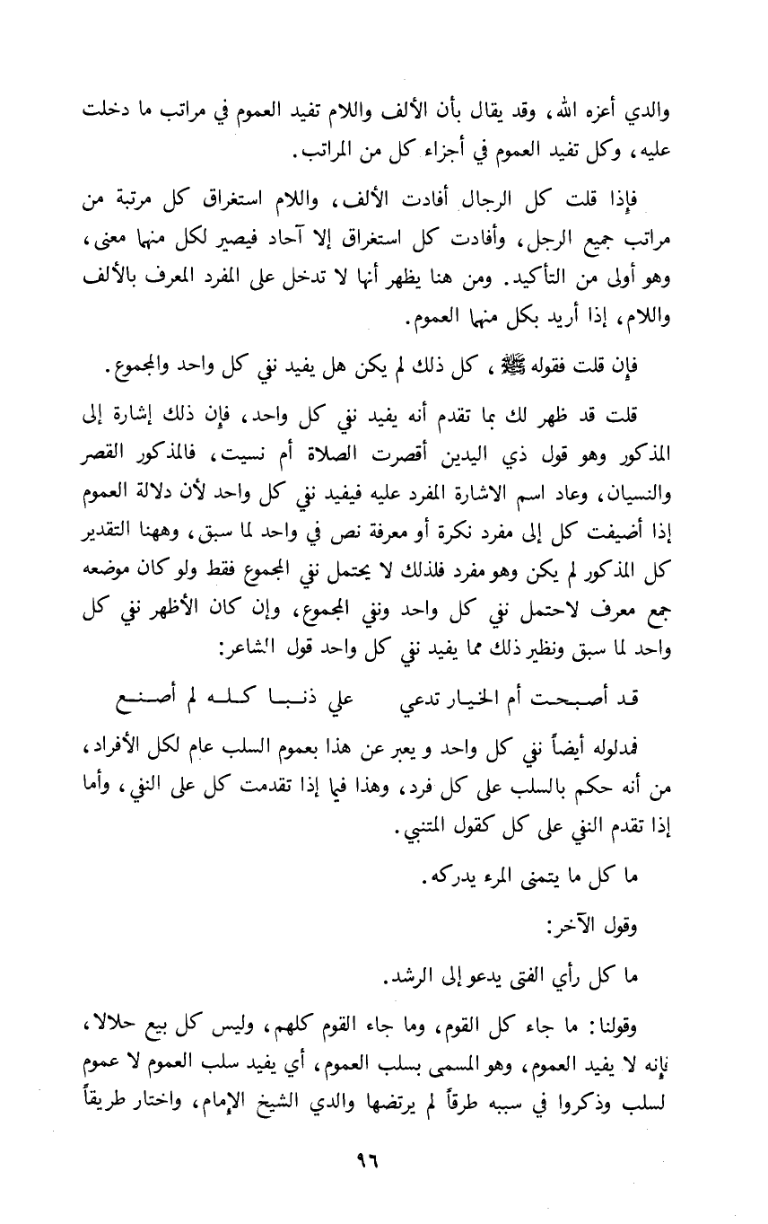 والدي أعزه الله وقد يقال بأن الألف واللام تفيد العموم في مراتب ما دخلت عليه وكل تفيد العموم في أجزاء كل من المراتب.