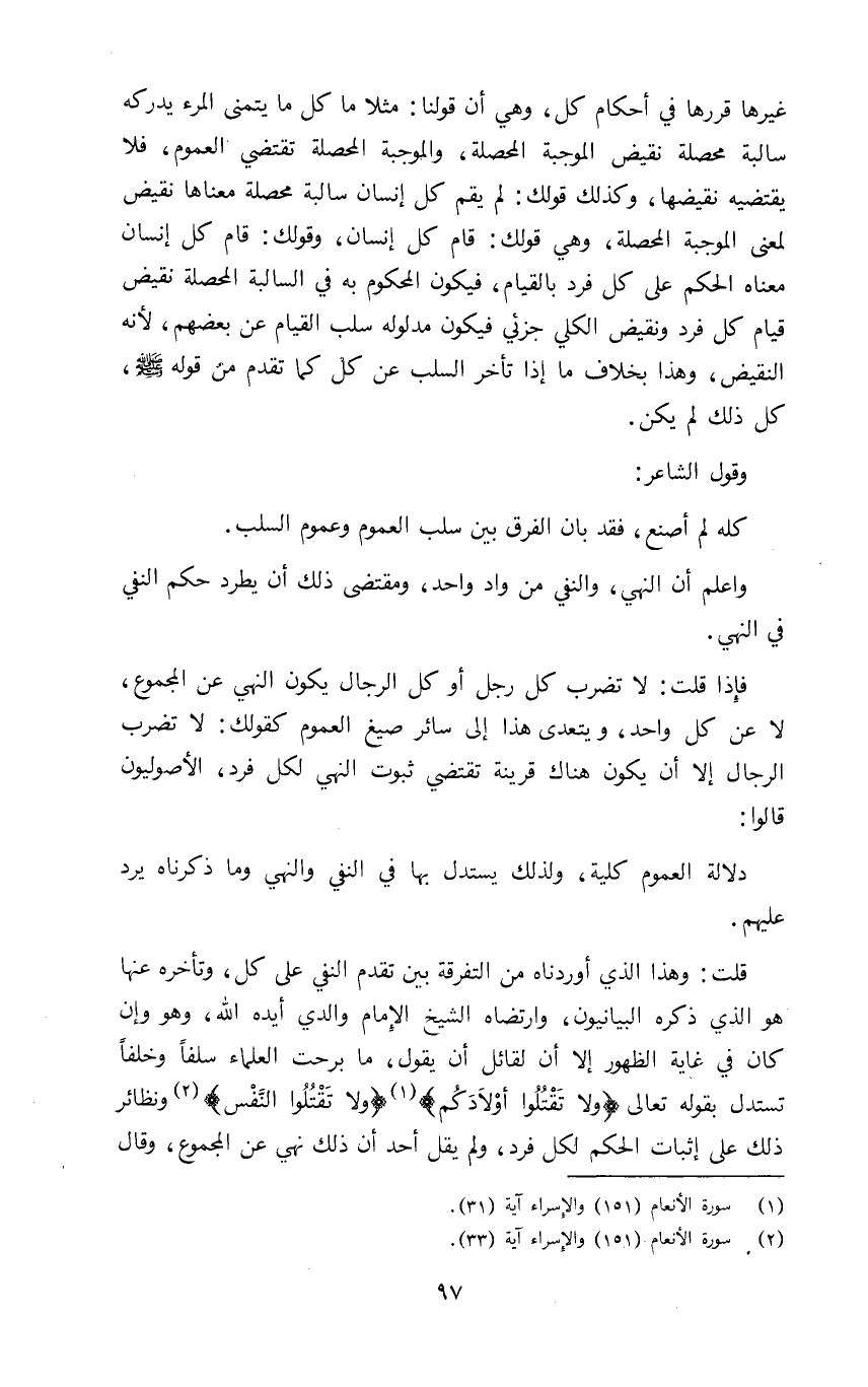 قلت: وهذا الذي أوردناه من التفرقة بين تقدم النفي على كل وتأخره عنها هو الذي ذكره البيانيون وارتضاه الشيخ الإمام والدي أيده الله وهو ان كان في غاية الظهور الا ان لقائل ان يقول ما برحت العلماء سلفا وخلفا تستدل بقوله تعالى: {وَلا تَقْتُلُوا أَوْلادَكُمْ} 1 {وَلا تَقْتُلُوا النَّفْسَ} 2 ونظائر ذلك على إثبات الحكم لكل فرد ولم يقل أحد ان ذلك نهي عن المجموع وقال