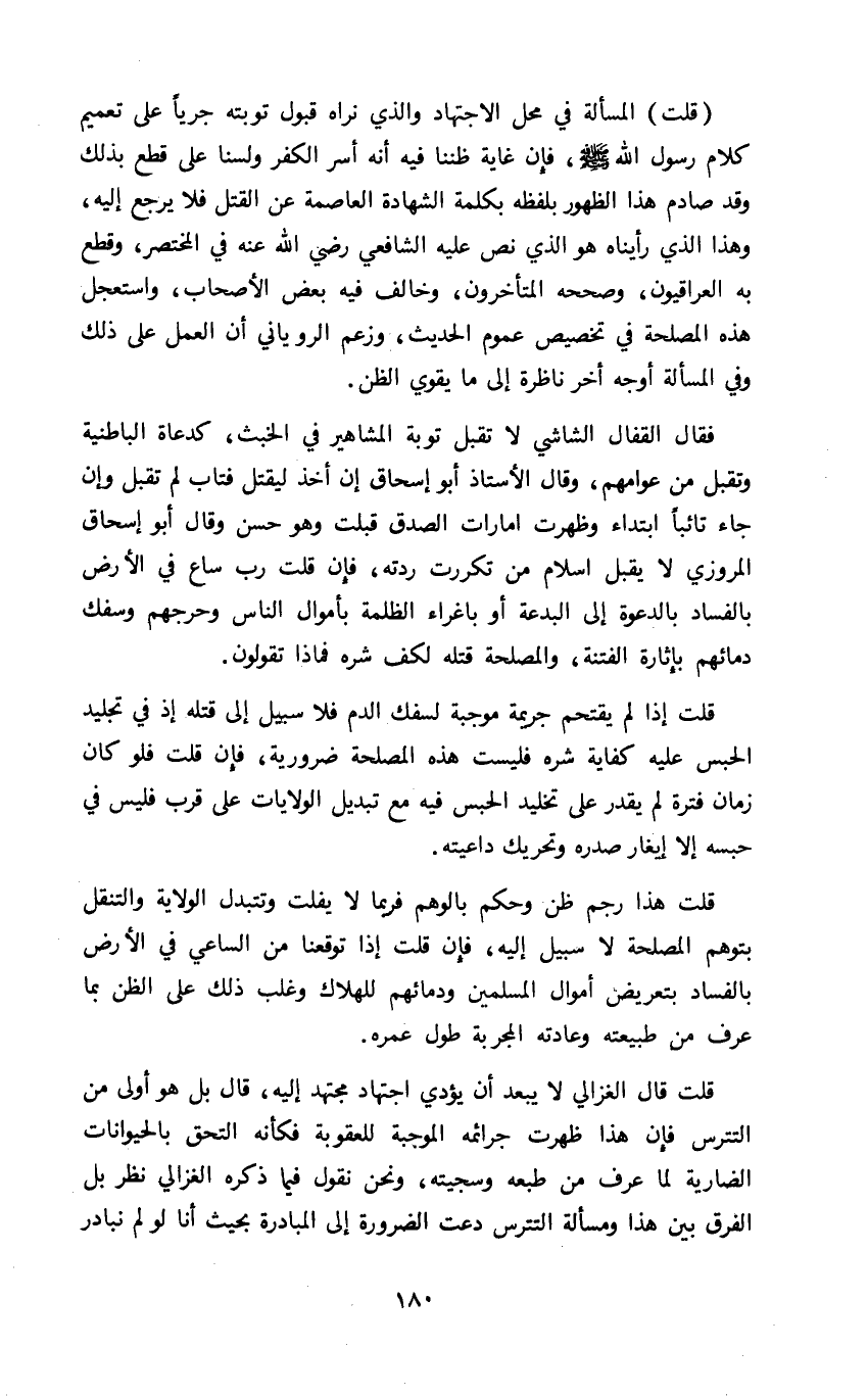 قلت إذا لم يقتحم جريمة موجبة لسفك الدم فلا سبيل إلى قتله إذ في تجليد الحبس عليه كفاية شره فليست هذه المصلحة ضرورية فإن قلت فلو كان زمان فترة لم يقدر على تخليد الحبس فيه مع تبديل الولايات على قرب فليس في حبسه إلا إيغار صدره وتحريك داعيته