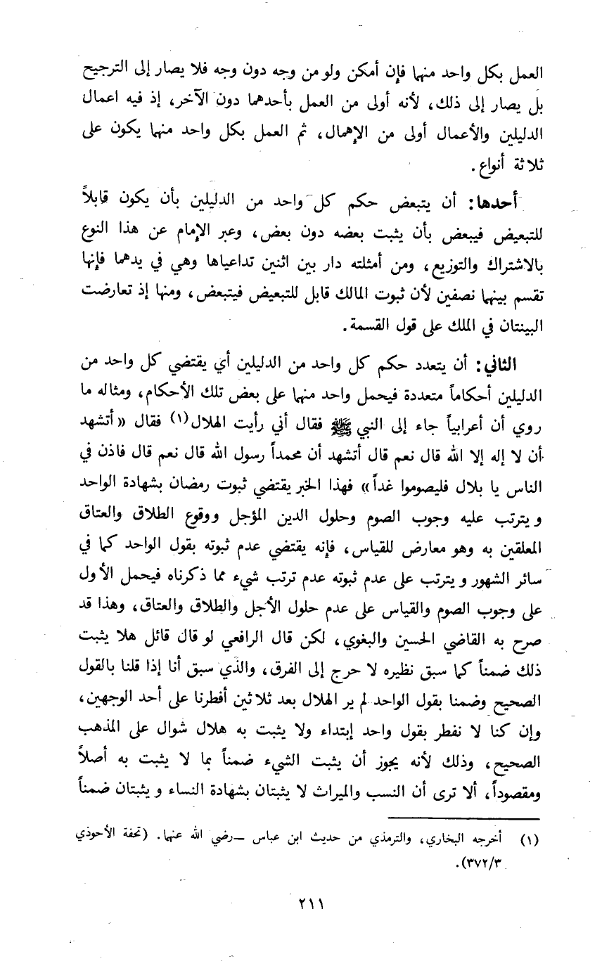 الثاني أن يتعدد حكم كل واحد من الدليلين أي يقتضي كل واحد من الدليلين أحكاما متعددة فيحمل واحد منهما على بعض تلك الأحكام ومثاله ما روي أن إعرابيا جاء إلى النبي صلى الله عليه وسلم فقال إني رأيت الهلال1 فقال: "أتشهد أن لا إله إلا الله" قال نعم قال: "أتشهد أن محمدا رسول الله" قال نعم قال: "فأذن في الناس يا بلال فليصوموا غدا" فهذا الخبر يقتضي ثبوت رمضان بشهادة الواحد ويترتب عليه وجوب الصوم وحلول الدين المؤجل ووقوع الطلاق والعتاق المعلقين به وهو معارض للقياس فإنه يقتضي عدم ثبوته بقول الواحد كما في سائر الشهور ويترتب على عدم ثبوته عدم ترتب شيء مما ذكرناه فيحمل الأول على وجوب الصوم والقياس على عدم حلول الأجل والطلاق والعتاق وهذا قد صرح به القاضي الحسين والبغوي لكن قال الرافعي لو قال قائل هلا يثبت ذلك ضمنا كما سبق نظيره لا حرج إلى الفرق والذي سبق أنا إذا قلنا بالقول الصحيح وضمنا بقول الواحد لم ير الهلال بعد ثلاثين أفطرنا على أحد الوجهين وإن كنا لا نفطر بقول واحد ابتداء ولا يثبت به هلال شوال على المذهب الصحيح وذلك لأنه يجوز أن يثبت الشيء ضمنا بما لا يثبت به أصلا ومقصودا ألا ترى أن النسب والميراث لا يثبتان بشهادة النساء ويثبتان ضمنا