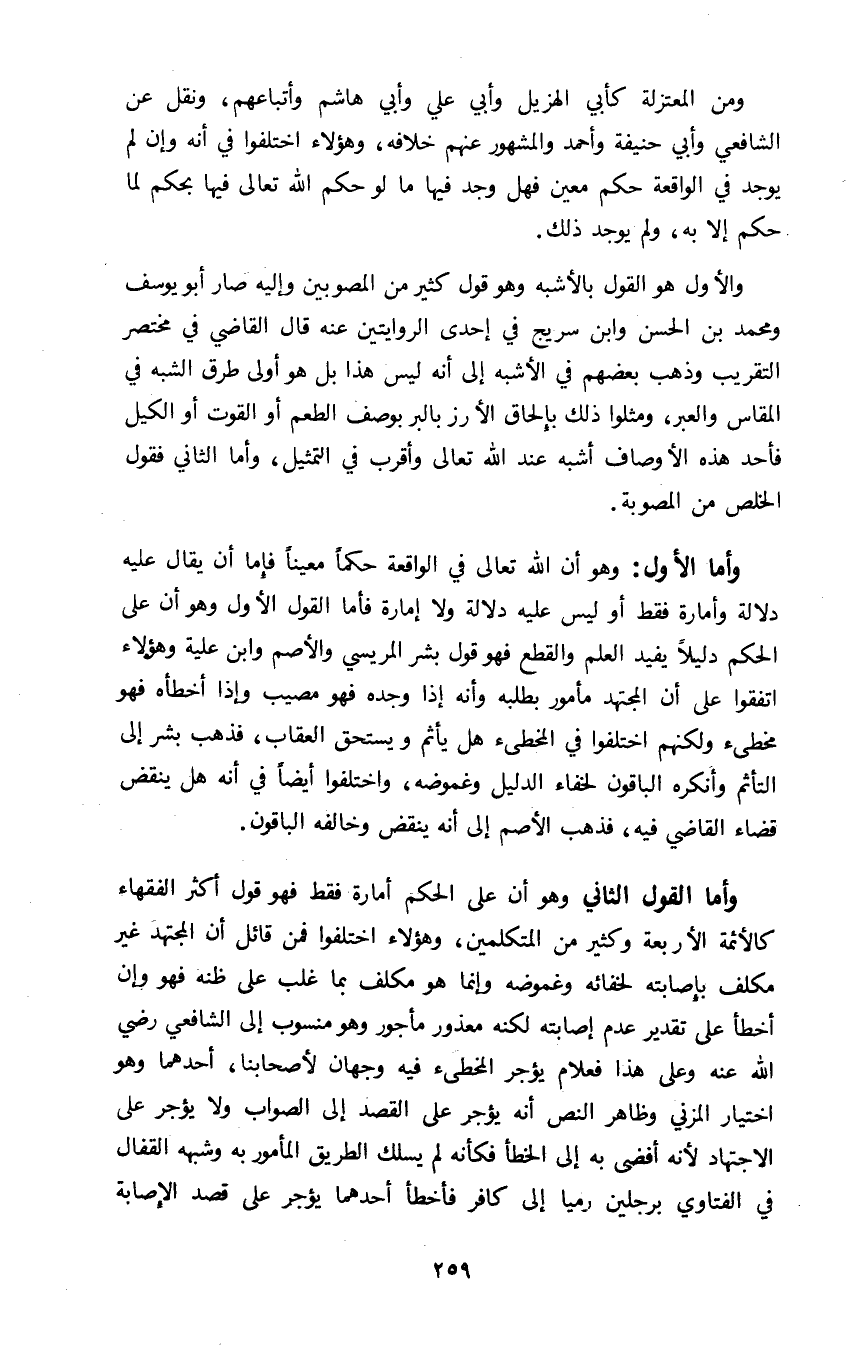 وأما الأول وهو أن الله تعالى في الواقعة حكما معينا فإما أن يقال عليه دلالة وأمارة فقط أو ليس عليه دلالة ولا أمارة فأما القول الأول وهو أن على الحكم دليلا يفيد العلم والقطع فهو قول بشر المريسي والأصم وابن علية وهؤلاء اتفقوا على أن المجتهد مأمور بطلبه وأنه إذا وجده فهو مصيب وإذا أخطأه فهو مخطئ ولكنهم اختلفوا في المخطئ هل يأثم ويستحق العقاب فذهب بشر إلى التأثم وأنكره الباقون لخفاء الدليل وغموضه واختلفوا أيضا في أنه هل ينقض قضاء القاضي فيه فذهب الأصم إلى أنه ينقض وخالفه الباقون